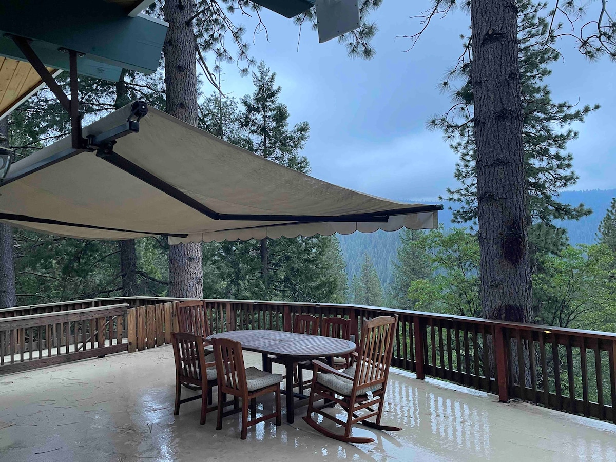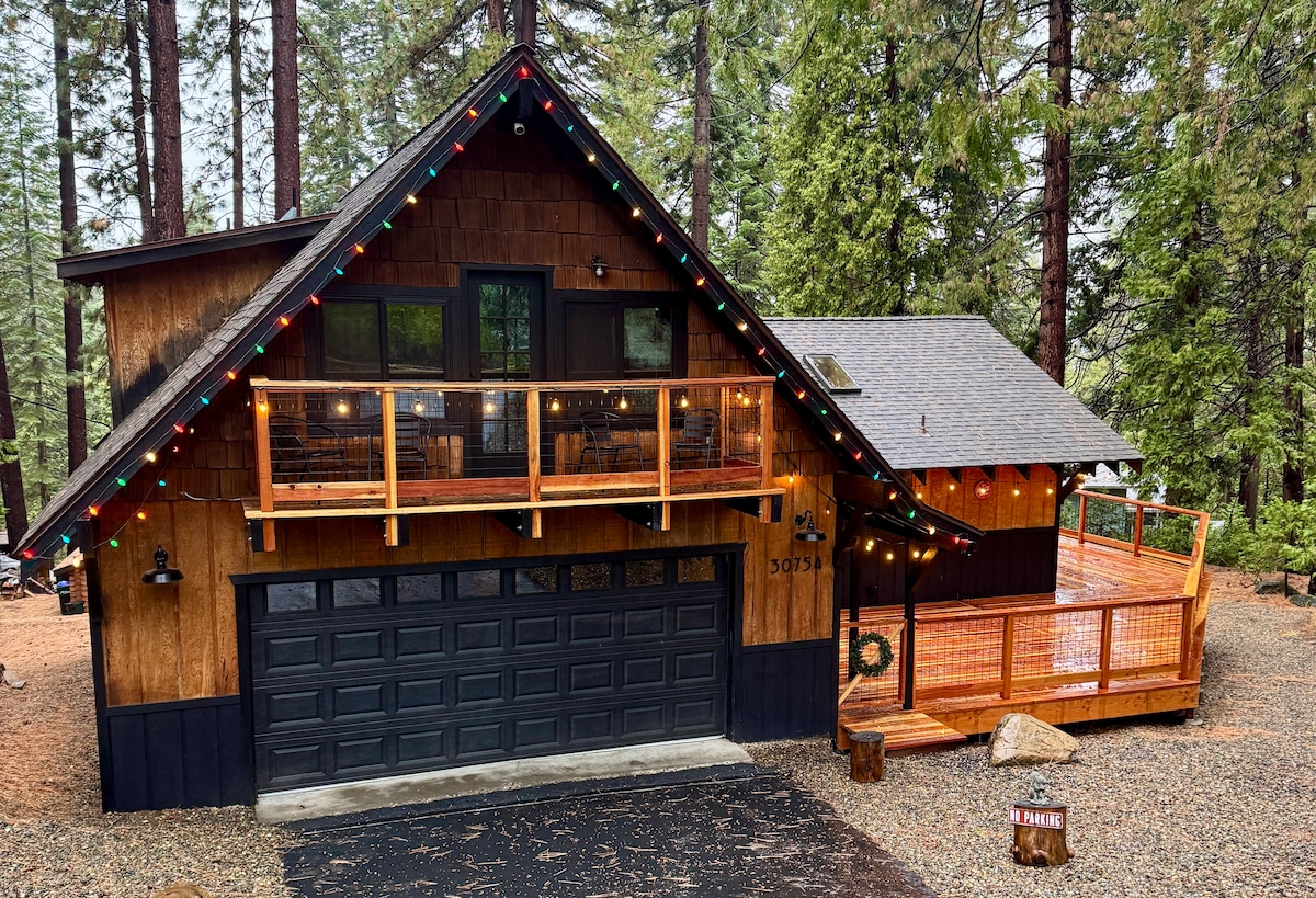Escape to The Chalet Getaway - a 1970s cabin that waits to wrap you in warm vintage vibes. The 20 foot bow front windows provide great views of the surrounding blue skies and beautiful trees. The large deck is a front row seat to the bountiful sights and sounds of nature, and is perfect for stargazing from the hot tub. Connect with loved ones in this cozy, nostalgic setting. 10 minutes to stunning Pinecrest Lake, 15 to Dodge Ridge. Surrounded by loads of fun outdoor activities.