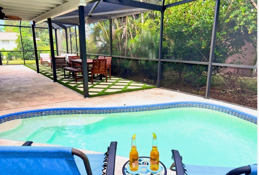 WELCOME PICKBALLERS! We are close to Naples Community Park and downtown Naples and beaches, perfect location. Unique one of a kind property, This house has been beautifully remodeled with Stunning Carrera marble floors, upgraded 4 bedroom 2 bath home with a separate pool house suite with its own kitchen and full bath that sleeps 4 guests. Beautiful landscaped yards with amazing pool. Only minutes to the beach. Private outdoor shower.