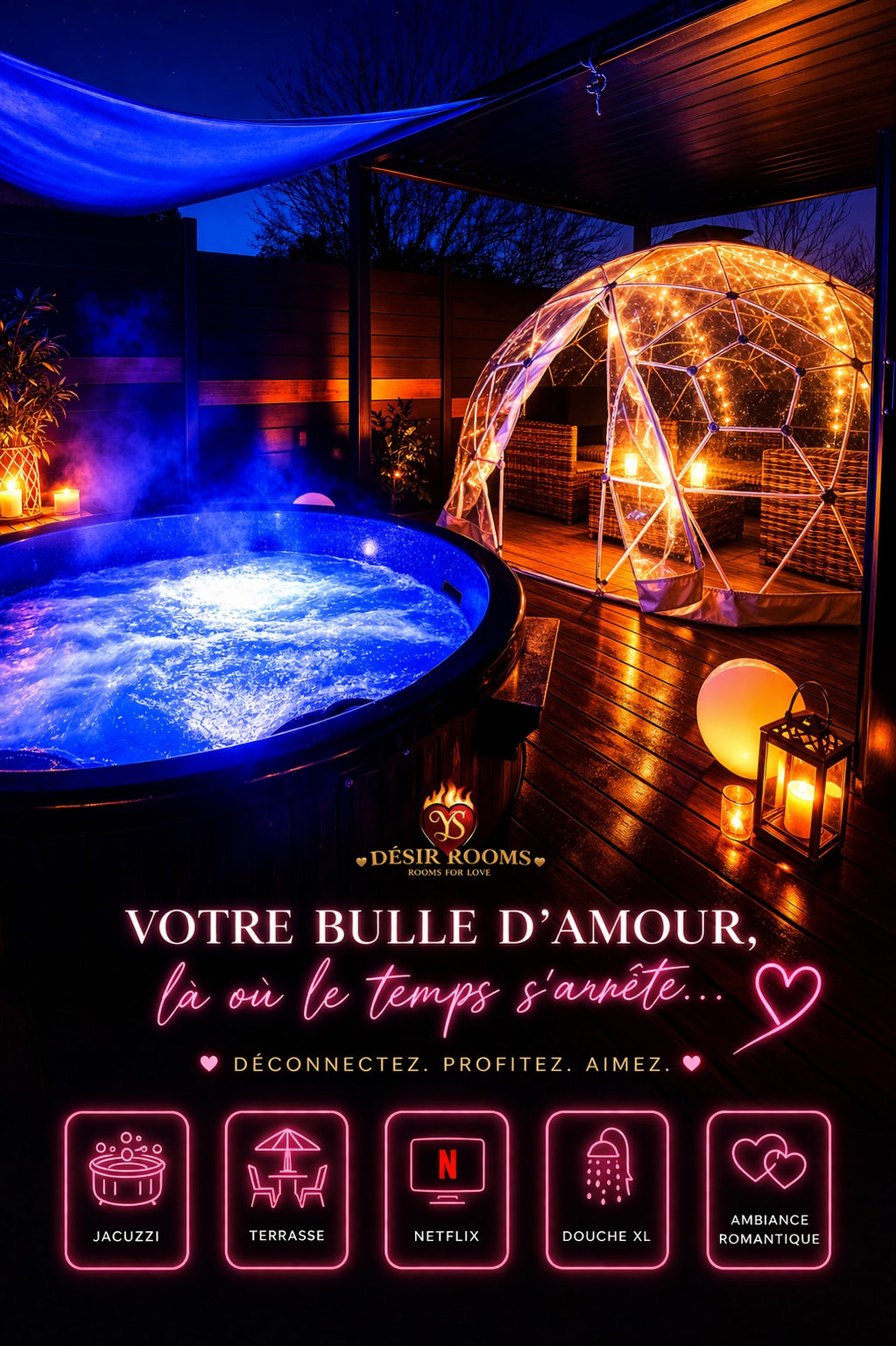 Découvrez notre élégant loft de luxe, un véritable cocon de raffinement et de passion, conçu pour une escapade inoubliable. Envie de raviver la flamme ou de surprendre votre moitié ? Offrez-vous une nuit romantique dans un cadre d’exception, agrémenté d’équipements et d’accessoires haut de gamme Pour sublimer votre expérience, des options supplémentaire sont également disponibles. Si c’est pour se faire plaisir, autant le faire sans compromis !