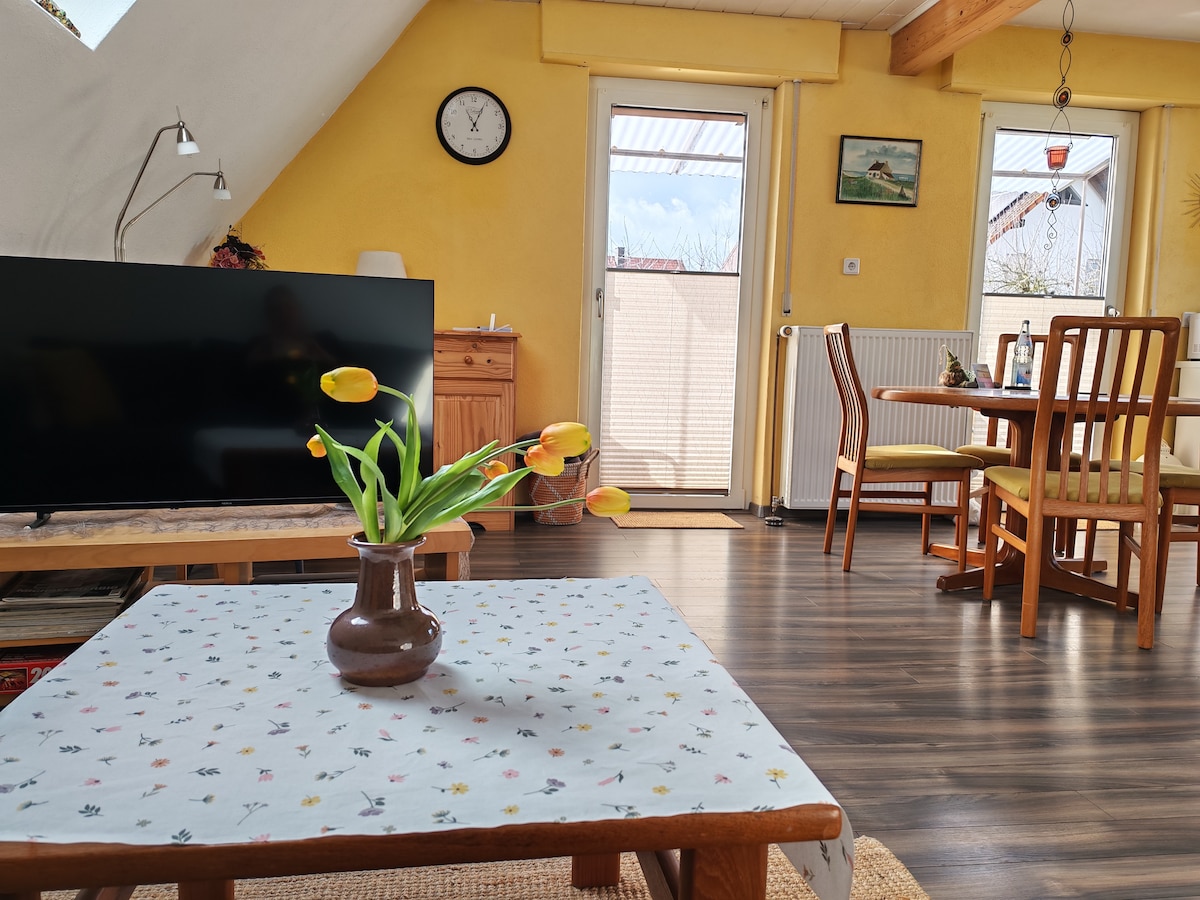 In front of our listed house from 1724, located in the heart of the old wine village of Hambach, the fountain of the church square splashes, overshadowed by the old chestnut tree. Directly behind it the vineyards offer a fantastic view over the Rhine valley. We are happy to open our bright, charming apartment, equipped with every modern comfort, for anyone who wants to explore the Palatinate. We offer a delicious breakfast with homemade products separately.
