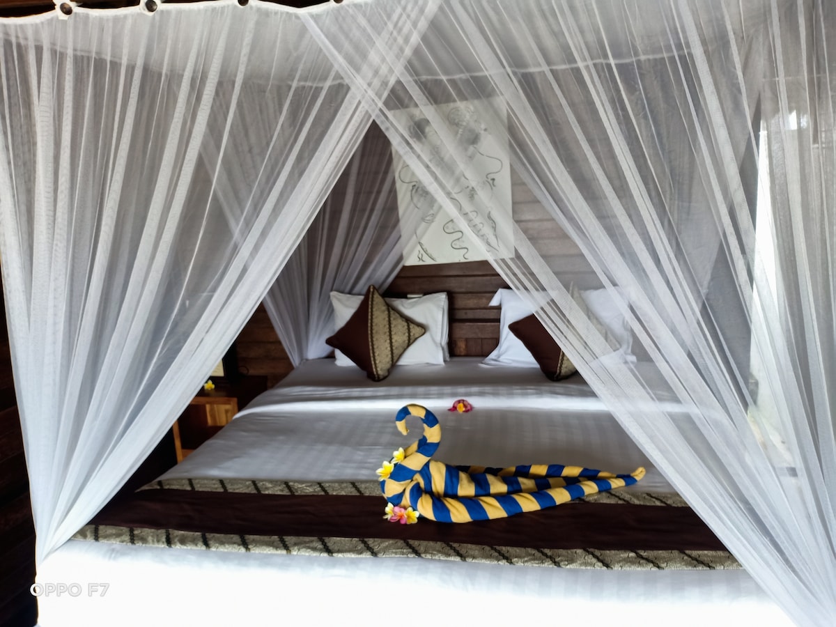 We have 6 beachfront villas at the resort, if your dates aren’t available, please check my profile for our other listings. This villa sits slightly higher than the others, offering incredible views. It has a smaller garden and no direct beach stairs but beach access is just a short walk down the path. Same stunning room, deck, and bathroom as all villas. Dive into breathtaking snorkeling with provided gear, unwind in the beachfront hot tub, and refresh in the Bali-style jungle bathroom.