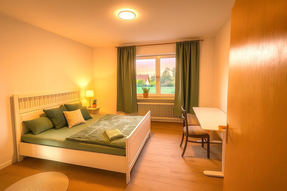 Vergiss deine Sorgen – in dieser geräumigen und ruhigen Unterkunft. Relax auf dem großzügigen Balkon mit Blick über Felder oder lass es dir im gemütlichen Wohn-Essbereich schmecken. Eine voll ausgestattete Küche ist vorhanden. Das stilvolle Bad liegt direkt neben dem Schlafzimmer. Die Wohnung wird über Infrarotheizung beheizt und ist dank der Photovoltaikanlage nahezu CO2-neutral. Eine E-Ladestation kann gegen Aufpreis genutzt werden.