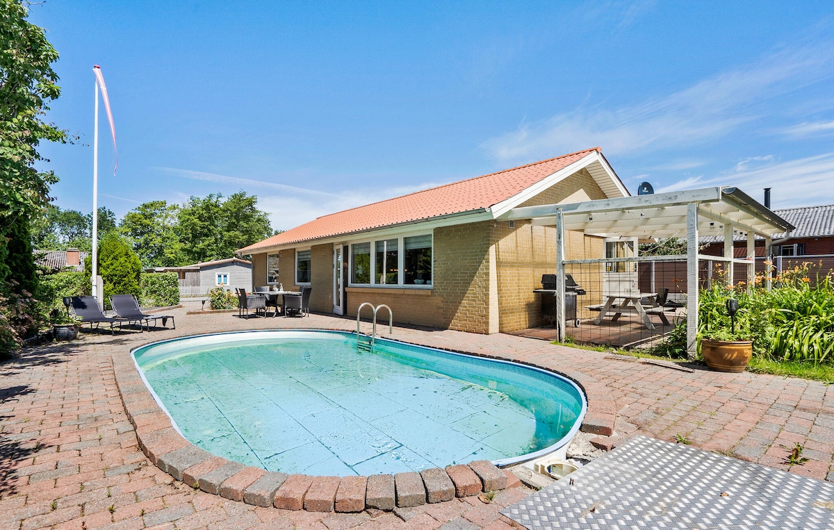 Enjoy a fabulous holiday in this impressive holiday home, located in the heart of charming Søndervig, just 150 meters from the enchanting North Sea beach. With space for up to 10 people, this house is the perfect retreat for families and friends seeking an unforgettable holiday experience. This spacious holiday home spans 240 m² and offers three luxurious bedrooms in the main house, all furnished with comfortable double beds. One bedroom has an en-suite bathroom with a shower and bathtub, as well as a walk-in wardrobe, while the other two share a large bathroom with a shower. The entire house features underfloor heating, powered by an energy-efficient heat pump, ensuring optimal comfort year-round. The separate guest house contains two additional bedrooms, each with its own toilet and shower. A shared living area includes a kitchenette with a refrigerator, wine cooler, and dishwasher; however, cooking is not permitted in this kitchenette. Look forward to unforgettable moments in the fantastic outdoor wellness area, where a large pool, a built-in whirlpool, and a refreshing outdoor shower await you, offering ultimate relaxation and enjoyment. The huge wooden terrace, extending over several levels, offers breathtaking views of the stunning dune landscape and invites you to spend long, relaxing hours outdoors. In the main house, you'll find a large, open-plan kitchen connected to the dining area by a breakfast bar, perfect for spending quality time together. The living room, with its large windows, is flooded with natural light and allows you to enjoy the spectacular views, not just while eating. Built in 2009 and renovated in 2022, it features modern and comfortable furnishings to ensure a pleasant stay for all guests. Explore charming Søndervig, which offers a variety of activities and attractions, including local shops, restaurants, and cultural events. Take long walks on the beach, explore the surrounding dunes, or try kitesurfing, windsurfing, or other outdoor activities with local providers nearby. This fantastic holiday home is the ideal choice for an unforgettable holiday on the North Sea coast. Book your stay now and look forward to creating wonderful memories!  The pool is closed from 1/10 to 1/4. However, the outdoor spa is switched on all year round.