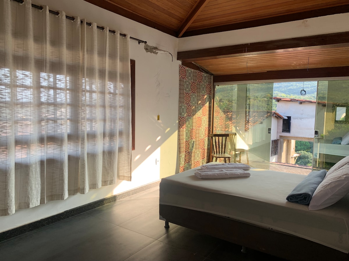 Encontre paz e bem-estar na Casa Lunaris, um espaço único cercado pela natureza, ideal para relaxar e se reconectar consigo mesmo. Conheça o Recanto Lunar: Quarto aconchegante, com características únicas, que se adapta às temperaturas: aconchegante e quente nos dias frios, fresco nos dias quentes. Perfeito para duas pessoas, com uma vista charmosa para o jardim e cama confortável e ampla. Cada estadia inclui: - Café da manhã - 15 minutos de massagem relaxante. - Escalda-pés terapêutico.
