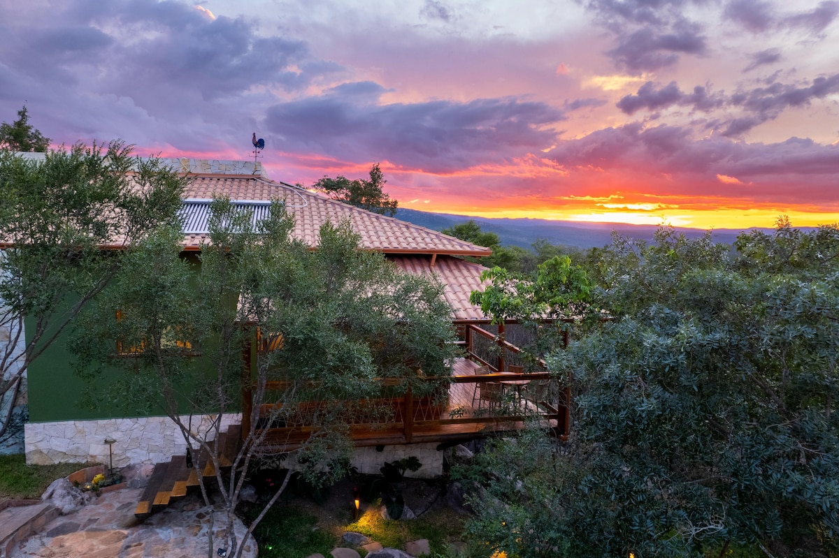 Casa Boutique com muito charme em Lençóis na Chapada Diamantina-Ba. Com 3 suítes amplas, com ar condicionado e enxoval de cama e banho com alto padrão, muito conforto e sofisticação em meio a natureza. A apenas 10 minutos das cachoeiras de águas cristalinas e a menos de 5 minutos de carro para a charmosa vila de Lençóis. Nossa casa faz parte do programa Modo Viagem - Casas que Valem a Viagem temporada 1- Casa Alto das Estrelas. Não aceitamos reservas para festas de aniversários e outros.
