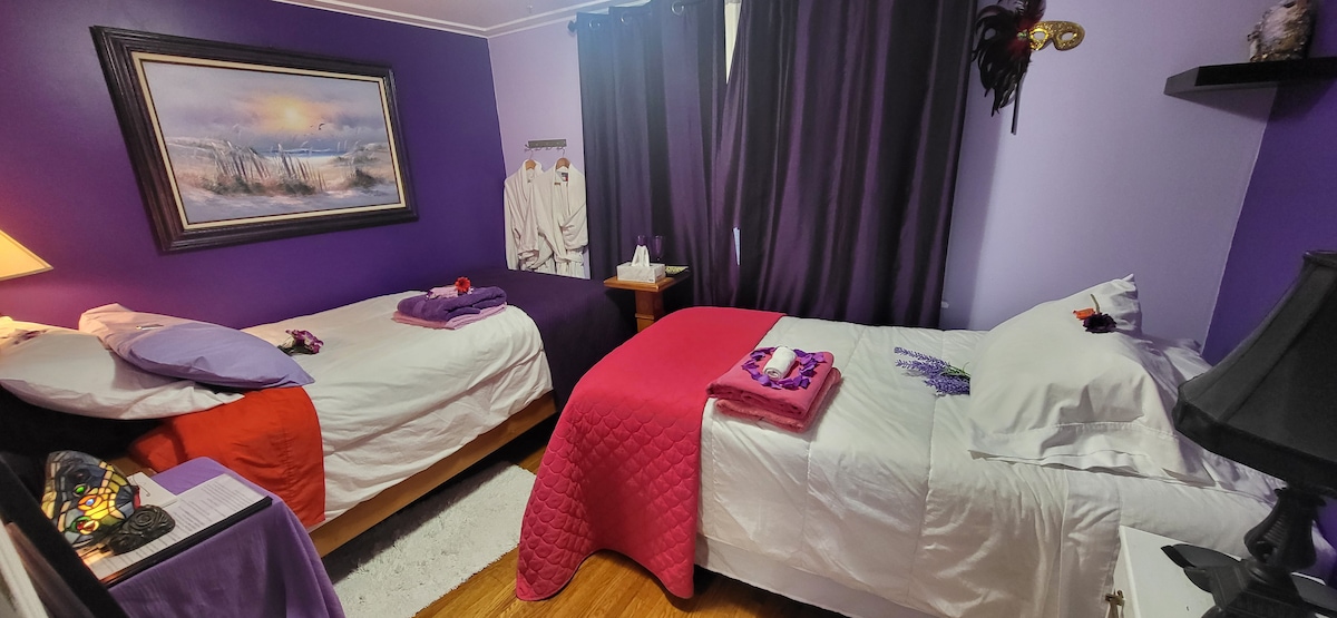 Two queen beds perfect for groups or family. I can also put a cot in the room, suitable for child or small adult. Luxurious ensuite with soaker tub and rainfall shower Complimentary breakfast items provided in a shared fridge for you to prepare each morning Lovingly restored 1880's farmhouse on a one acre country estate. The Daisy suite sleeps up to 5 people. Great for families or groups. The room has 2 queensize beds, cot or crib and a luxurious ensuite. Dog friendly for an additional fee.