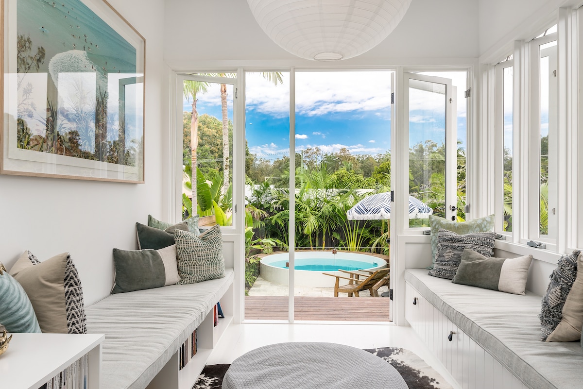 Newly built contemporary beachside cottage. Fall asleep to the sounds of the ocean. All new luxury furniture, fixtures and fittings in a relaxing neutral coastal palette. High ceilings, fans and airconditioning in all rooms. Leather couches, top of the range comfortable beds, fast speed Wifi and 55inch smart tvs in all rooms. Set in a peaceful sought after area, 5 mins walk to beach and within walking distance to Byron town centre. Everything you need for a relaxing memorable holiday