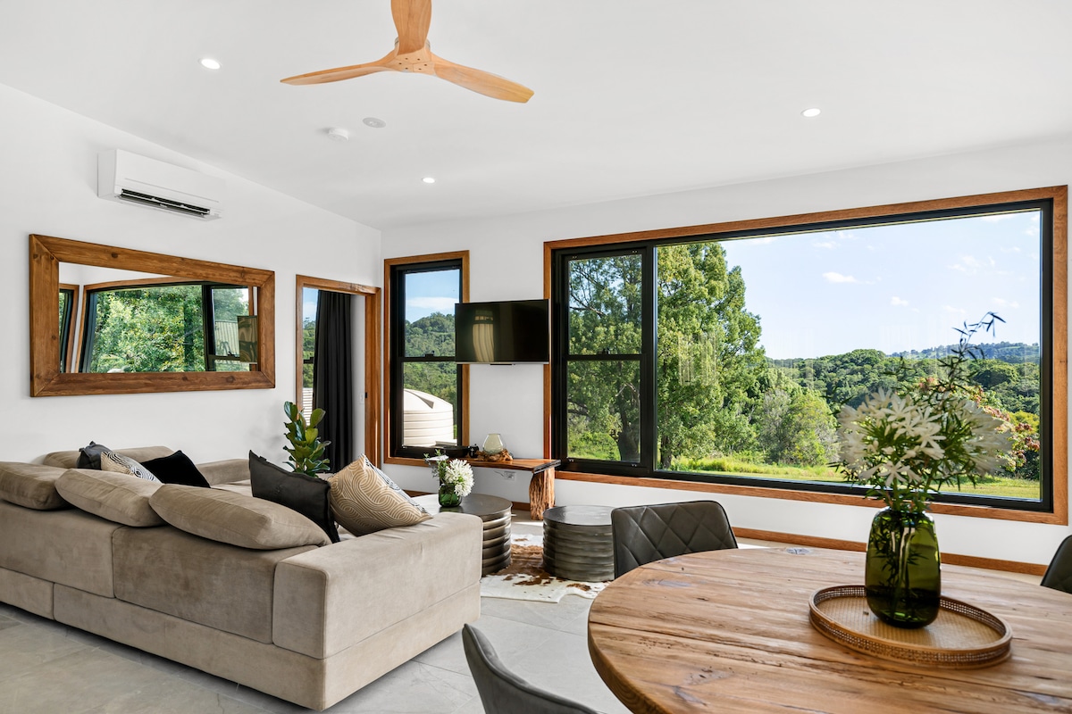 Breathtaking 270 degree distant views from sunrise to sunset. A newly built, self-contained eco villa, on a working cattle farm, providing stunning vistas of Byron Bay Hinterland from your bed! Natural lime-rendered hempcrete walls, rustic hardwood beams, & timber floors. Open plan with floor-to-ceiling glass. French doors in the bedroom open to the claw foot bath on the deck. Easy driving distance from Mullumbimby, Byron Bay, Brunswick Heads, Ballina airport and Coolangatta / Gold Coast.