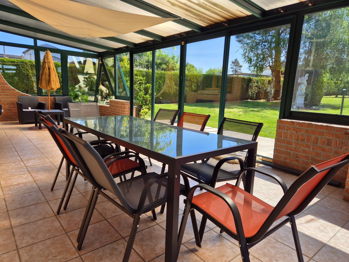 Jolie maison calme et plain pied, de 60m2. À 100m du golf, 15 min de l’aéroport de Lille , 22 min du Stade Pierre Mauroy, 25 min de Lille. A 5 min de l’étang de la Mousserie, centres équestres, Voie Verte, pour de magnifiques ballades. Un beau Salon/séjour lumineux (canape-lit) s’ouvre Terrasse verdoyante et individuelle de 19m2.. Une Chambre spacieuse ( lit 160/200), une cuisine équipée, une Sdb avec douche. WC séparé et garage individuel. Rangements Draps/linge de toilette fournis