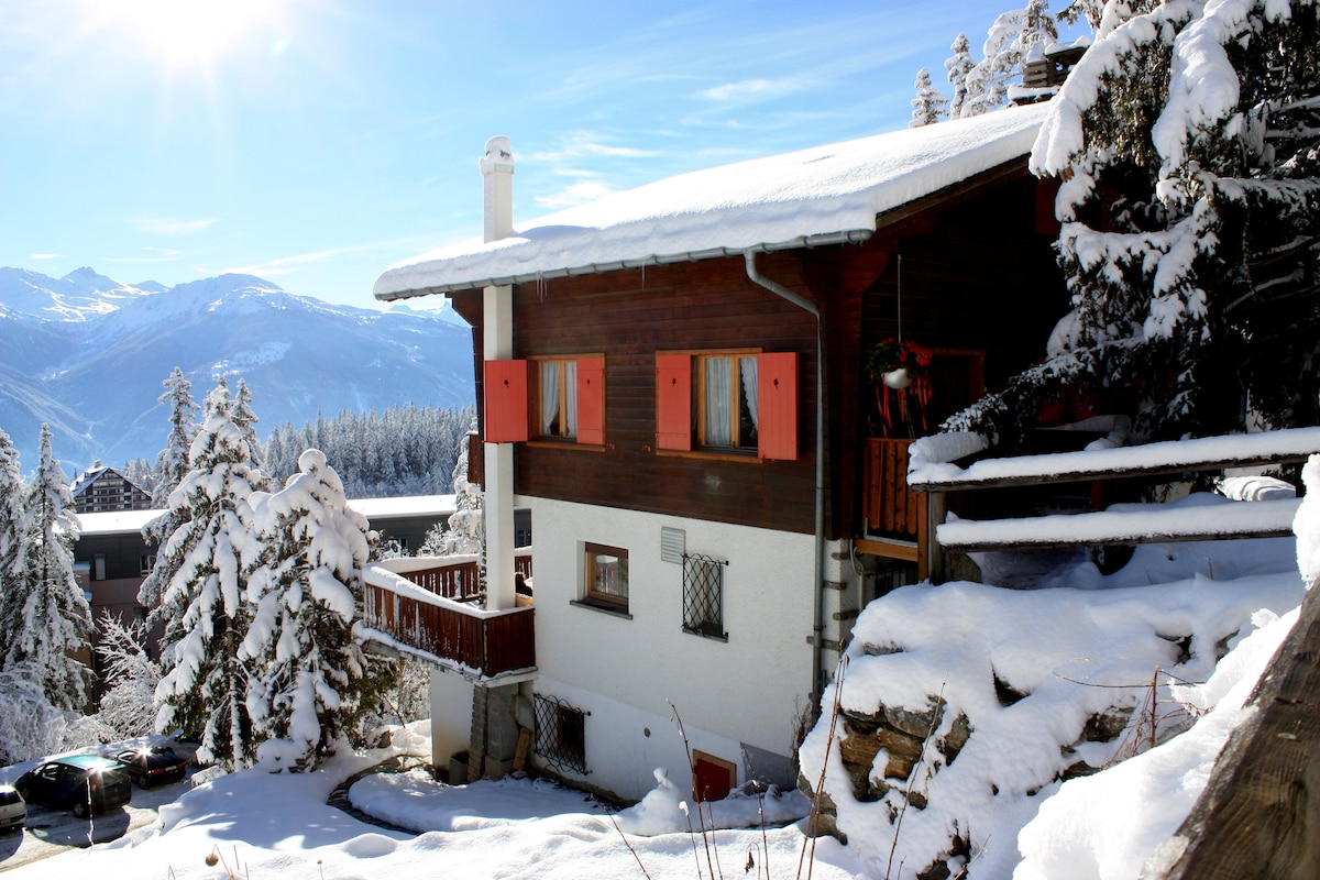 A very cosy little chalet (62m2) 2 pers at the top of the Lodge , very quiet location. In front line facing the mountains, sight entirely released with breathtaking views over the Swiss Alps and its sunsets. A little away from the turbulent and noisy ski resort but still reachable in one minute by car or 500m walk to the free ski bus. Free outdoor parking. We are all ski teachers and can provide ski lessons at attractive rates