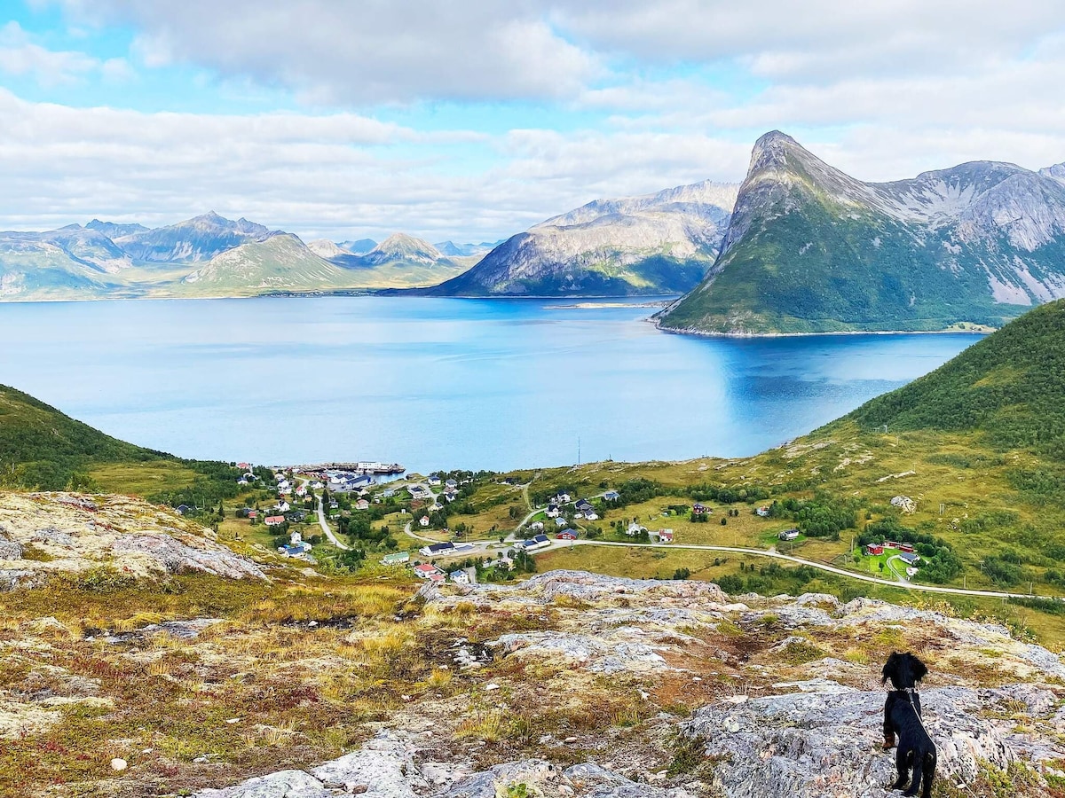 Et trivelig og romslig hus på yttersia av kvaløya med hav- fjell -Nordlys og utsikt. Personlig Serv/Hente og bringe/ billeie / guiding / Fisketur - Båtturer Huset inneholder stue, kjøkken, bad, 3 soverom og glasstue med mulighet for soveplasser. Etter en fin dag til fjells eller til havs kan dagen avsluttes i badstue eller grillhytte. Felles inngang med privat leilighet. tilleggstjenester, bookes separat: -Hente/bringe tjeneste t/r Tromsø flyplass -Billeie m/u sjofør -Båttur/Fisketur.