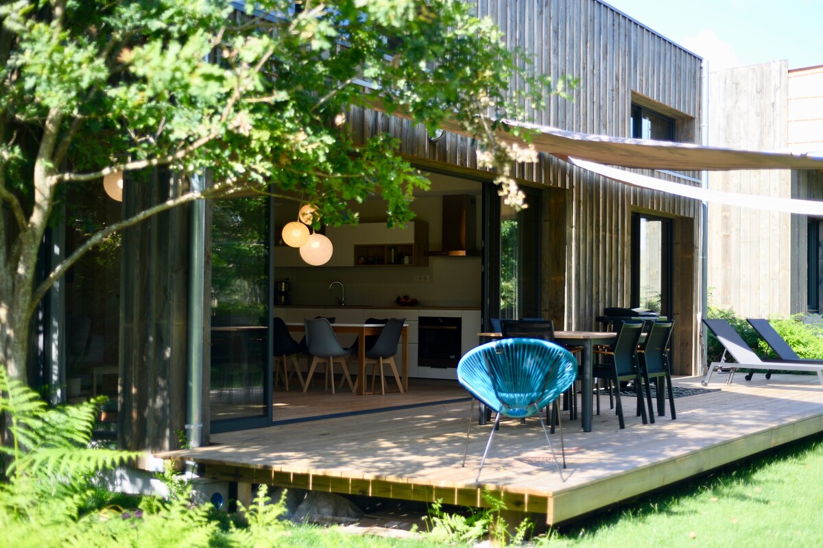This contemporary bioclimatic house in the green has only been built in 2021. It is located in a completely quiet surrounding. At the same time it is located not far from the beaches. The spacious living room opens up to a 50m2 wooden terrace and a garden with a stunning scenic view. Available all year round and also for long term stays. Fiber Internet available for remote working.