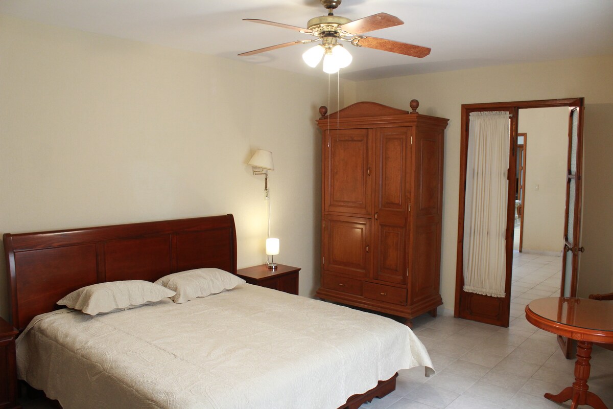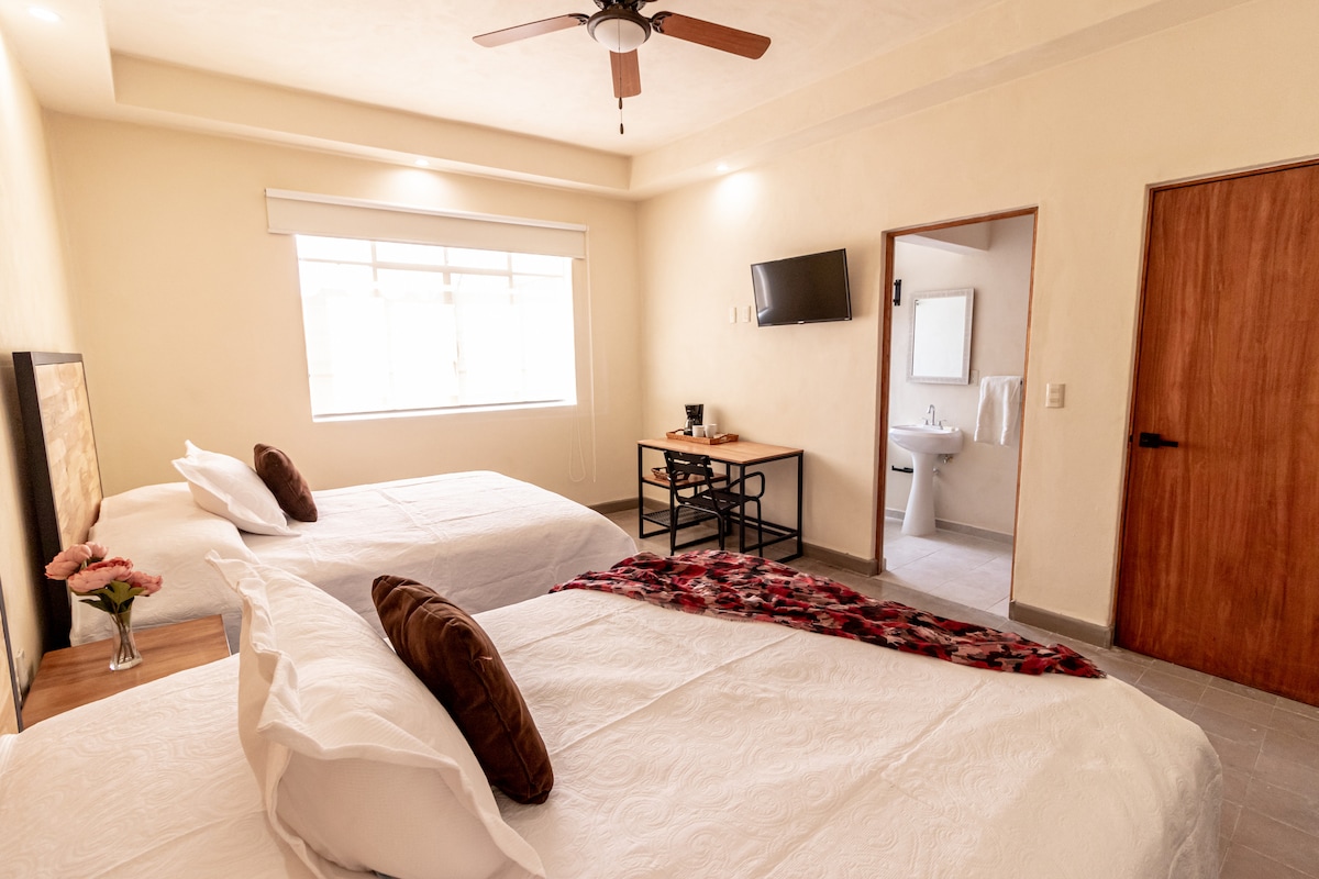 HABITACIÓN PRIVADA, CÓMODA Y BIEN EQUIPADA. Esta privada y acogedora habitación cuenta con cama matrimonial, baño privado completo, clóset amplio, ventilador y mesa de trabajo. Como beneficio exclusivo para nuestros huéspedes, al mostrar tu reservación de Casa Aldama, obtienes 10% de descuento en todas las cuentas el restaurante Bodegante, ubicado justo enfrente. Vive León como un local, con comodidad y ventajas únicas. ¡Reserva ahora y aprovecha este beneficio especial!