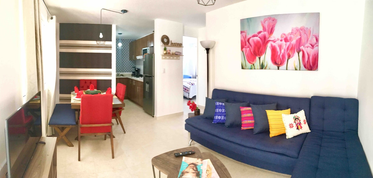 El lugar ideal con espacios privados (recámara, baño completo, sala, comedor y cocina). La ubicación es perfecta a media cuadra de Plaza Mayor y fresco, así como el Parque Panorma donde encontrarás restaurantes, cafés, tiendas, bancos, lugares para desayunar, y más. Importante: lunes y viernes está incluida la limpieza del departamento!