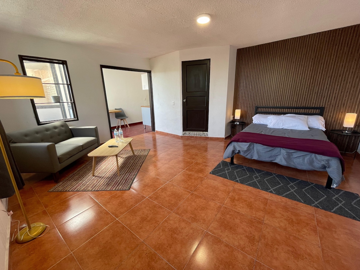 Loft in the heart of downtown León with a double bed, 50” TV, fast Wi-Fi, and a kitchenette equipped with a mini-fridge with freezer, microwave, utensils, and more. It also features a dining area for two, a balcony, and a full bathroom with hot water. Half a block from the main street (Fco. I. Madero), surrounded by nightlife, restaurants, cafés, museums, and attractions such as the Cathedral Basilica, the Expiatory Temple, and the Arch of the Calzada.