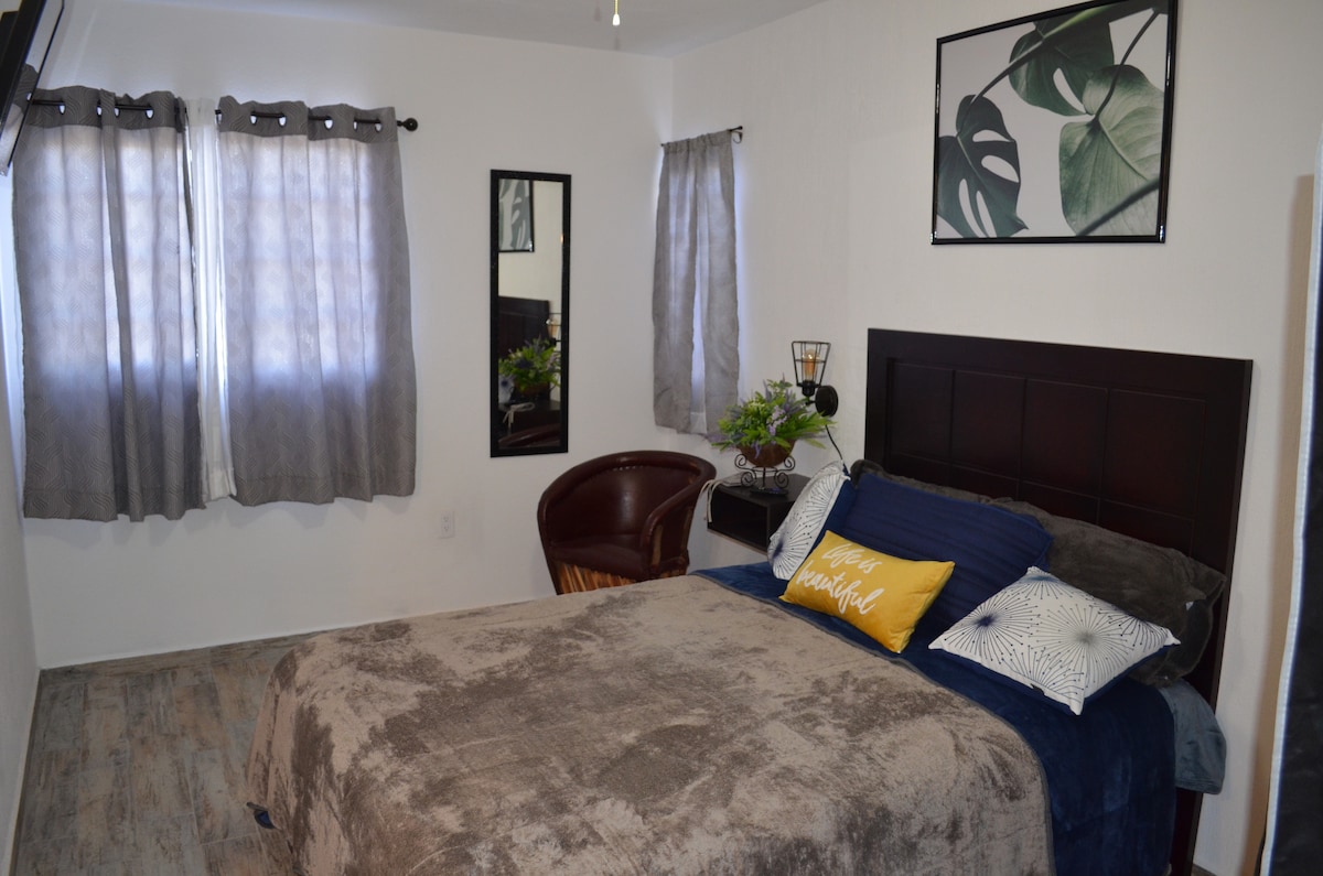 HABITACIÓN PRIVADA, CÓMODA Y BIEN EQUIPADA. Esta privada y acogedora habitación cuenta con cama matrimonial, baño privado completo, clóset amplio, ventilador y mesa de trabajo. Como beneficio exclusivo para nuestros huéspedes, al mostrar tu reservación de Casa Aldama, obtienes 10% de descuento en todas las cuentas el restaurante Bodegante, ubicado justo enfrente. Vive León como un local, con comodidad y ventajas únicas. ¡Reserva ahora y aprovecha este beneficio especial!