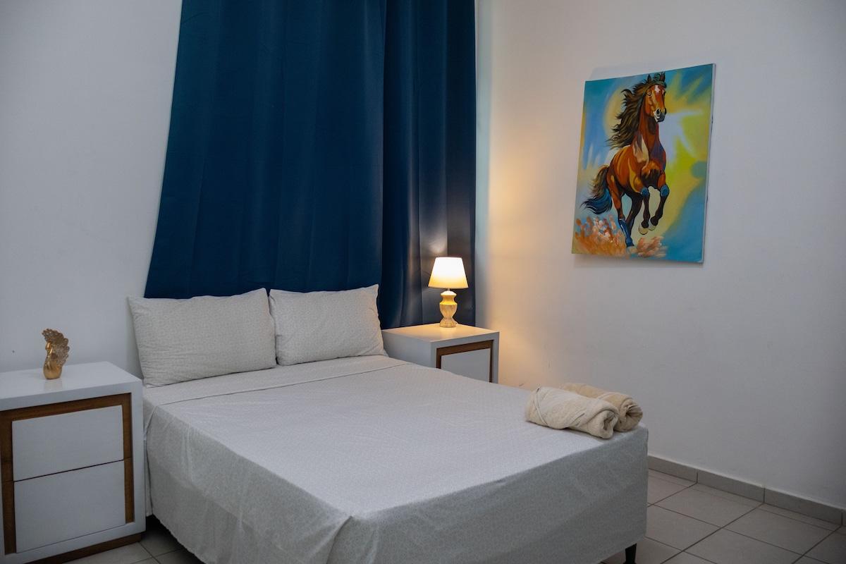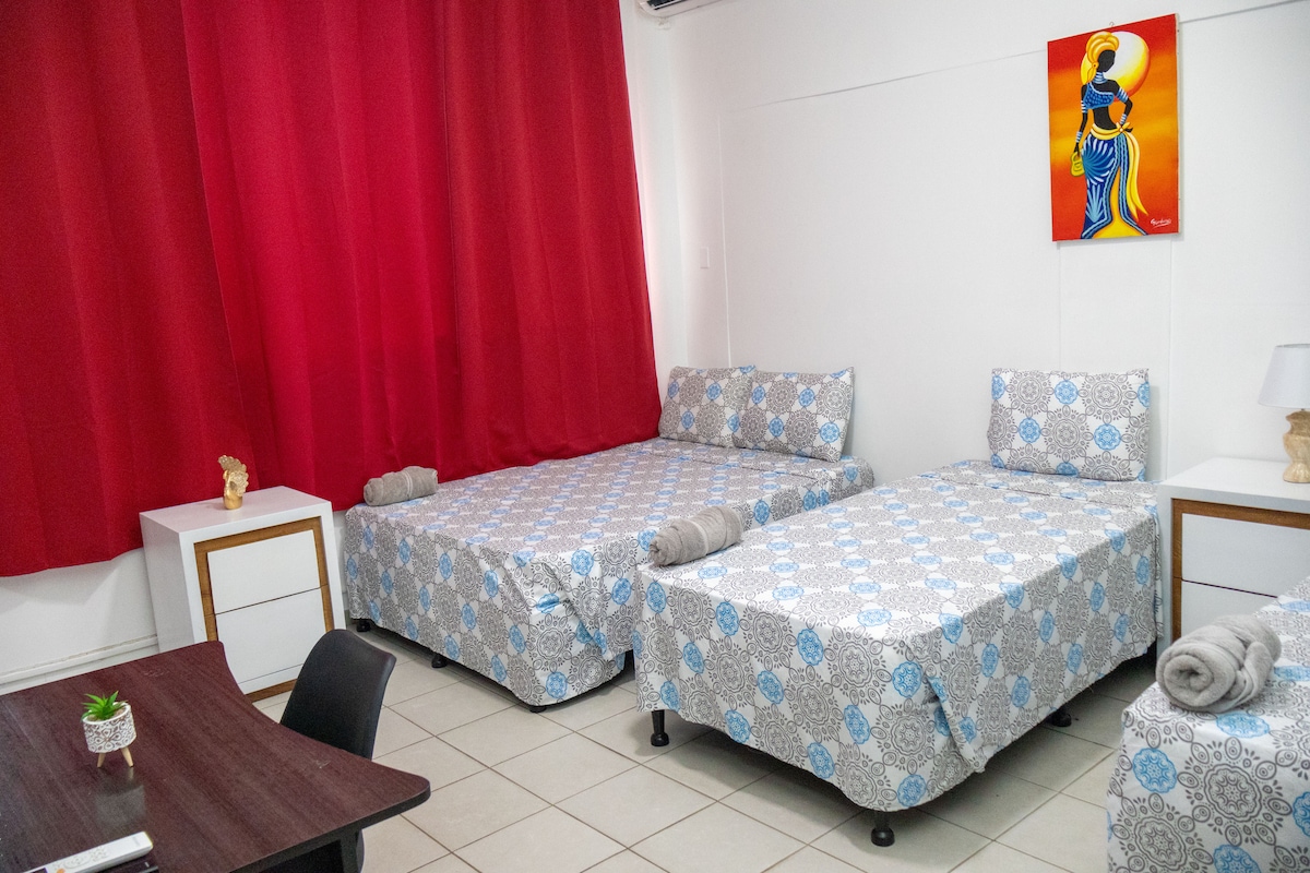 En esta habitación tendrás disponible 2 camas matrimoniales en las que puedes acomodar de 2,3 o 4 personas. Es adecuada para una pareja y 2 niños pequeños o un niño grande. Siempre con la comida de espacio y la ambientación de área climatizada. Es excelente para una familia pequeña o para 2 personas que viajan juntas.
