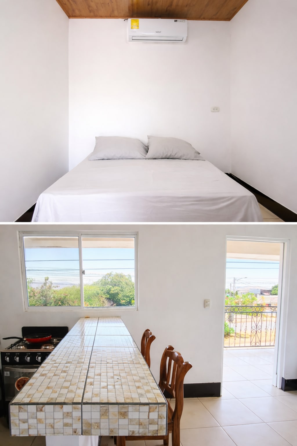 Apartamento Amueblado de 2 Habitaciones, Aire Acondicionado, cocina equipada, comedor 4 sillas, sala con sofá donde puede agregar huésped de sofá y TV Smart. Al salir del apartamento hay patio interno que comparte con otros 3 apartamentos como un jardín acogedor. Es seguro, tranquilo, sobre la carretera a Poneloya frente a bahía de bus para ir al Centro de León y hacia las playas de Poneloya - Las Peñitas.
