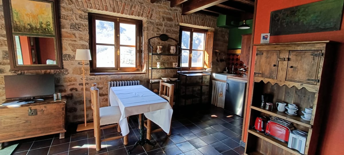 Alojamiento con estilo perfecto para viajes en grupo. Casa entera de 2 plantas recién reformada con elementos de calidad, mezcla de tradición y modernidad. Espacio para 6 personas, consta de 2 dormitorios, salón con sofá cama doble, cocina americana moderna y muy bien equipada, 2 baños completos (uno en cada planta) y guardaesquís. Zona tranquila, puedes aparcar en la calle a la puerta. Ubicada a 10 minutos de las estaciones de esquí, zona motera en verano, rutas de montaña y bici por la zona.