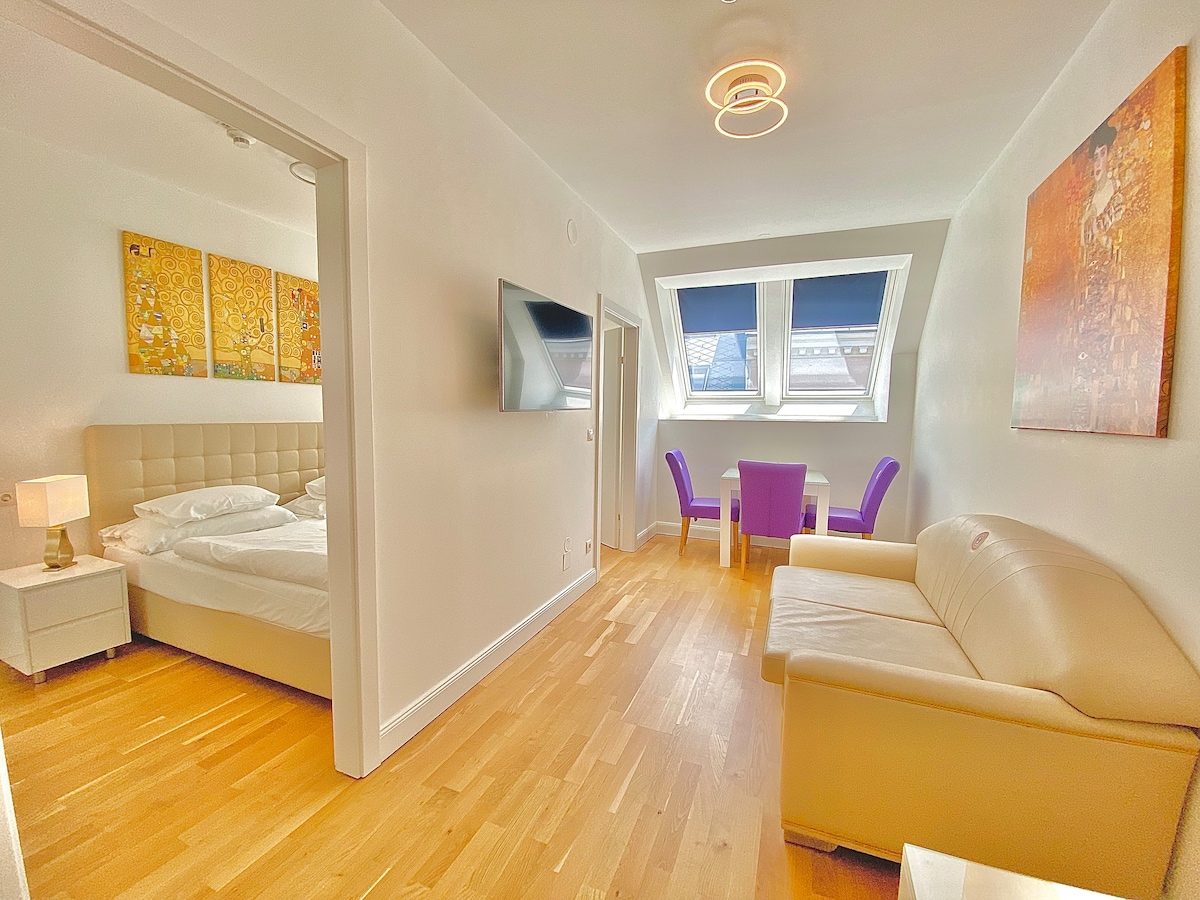 Discover city living at its finest in our newly renovated, highly central 40m² apartment. Nestled on the 2nd floor of a historic building, this exclusive space boasts a spacious living room, comfy bedroom, bathroom with toilet, and a well-equipped kitchen. Additional amenities include a sofa bed, TV, WLAN, washing machine, and a full kitchen setup. All your daily needs, shops, cafés and restaurants just around the corner. Immerse in art, culture, shopping and sights steps away.