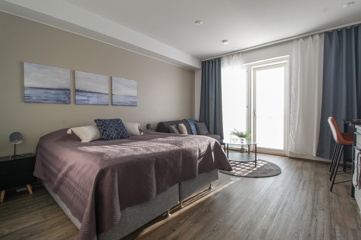 Vasta valmistunut uusi yksiö on kauniisti ja kodikkaasti sisustettu. Yksiö sijaitsee keskeisellä paikalla Kuopion torin ja sataman puolessa välissä. Asunnossa on runsaasti mukavuuksia käytössäsi vierailusi aikana mm. sauna, televisio, josta on mahdollisuus katsella suoratoistopalveluita (Elisa viihde premium, Netflix, Ruutu+) sisältöä. Mahdollisuus ilmaiseen pysäköintiin.