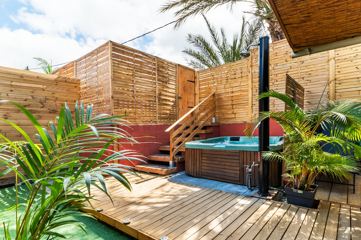 Modern Creole style wooden house with high-end private jacuzzi. 5-star rated vacation rental guaranteeing an optimal level of comfort and facilities. 160 feet from the sea ! Paddle board and snorkel masks provided. - 3 large air-conditioned bedrooms + brewers - Queen size beds & hotel range mattresses - free NETFLIX TV lounge + lounge under terrace - Fully equipped kitchen - Fiber optic Wi-Fi - BBQ in nice garden 100 m2 with deckchairs - Superb family beach & lagoon - PRM accessible