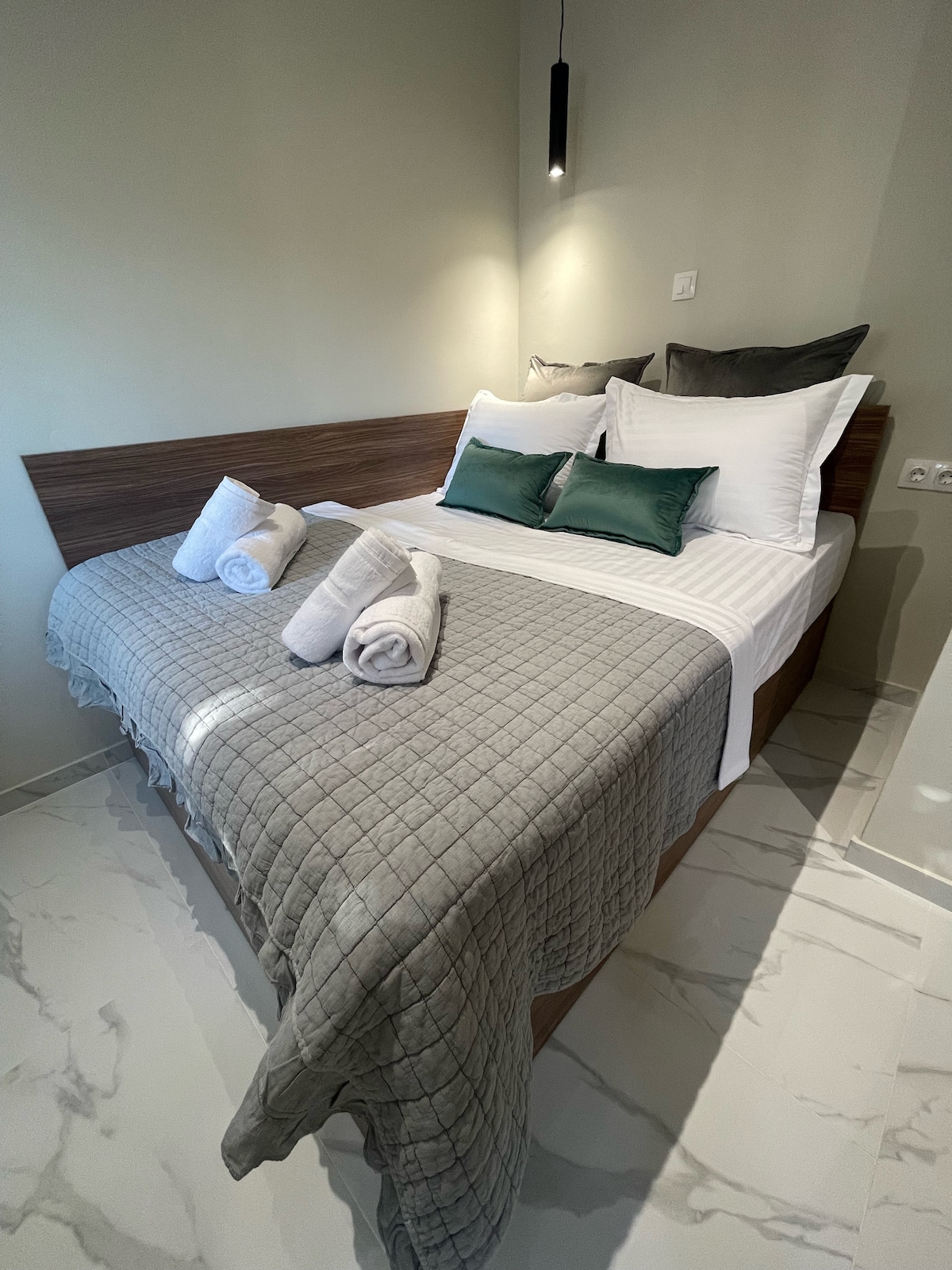 Beautiful studio with breathtaking view just 2 minutes from the beach! You can enjoy the beautiful view of the biggest Greek mountain Olympus of 12 Gods (mythology) and deep blue sea view by your balcony. In 600m from the house there are Beach Bars (Kyma,Asterias), super markets, restaurant. Famous Potamos beach is only 15' away (by car)with exotic waters and lots of beach bars. 25 minutes away from airport SKG 27' from a large mall 'Cosmos' 35' from the center of Thessaloniki by car.