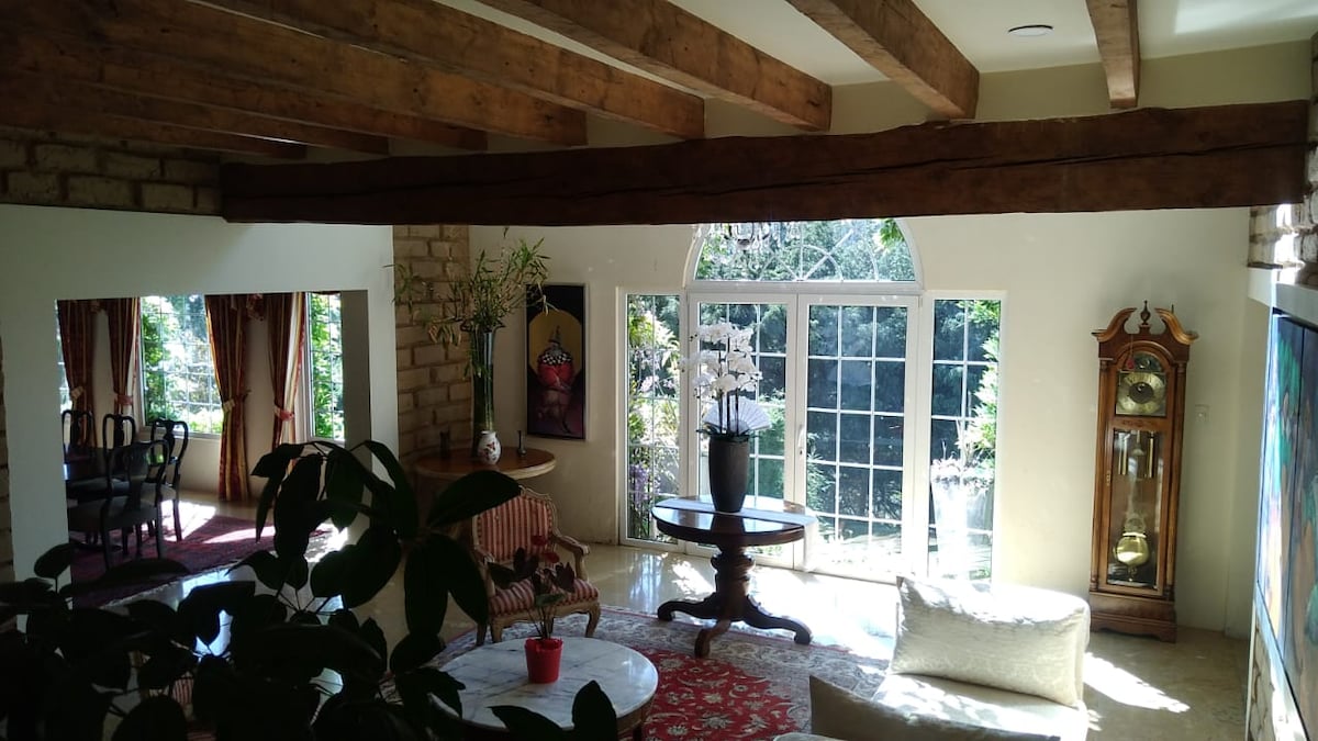 Un escape rápido para disfrutar con la familia o amigos muy cerca de la ciudad. Casa de campo espaciosa para 10 personas con muchas amenidades para disfrutar o descansar. 4 habitaciones con TV, 3 baños completos, 3 medios baño, estudio con sofá cama y pantalla de 90", chimenea, alberca con jacuzzi climatizada, sasador, jardín, red de volleyball, area para fogata, mini antro, billar, gimnasio, sonido ambiental, mesa de ping pong, WiFi. estacionamiento para 5 vehículos.