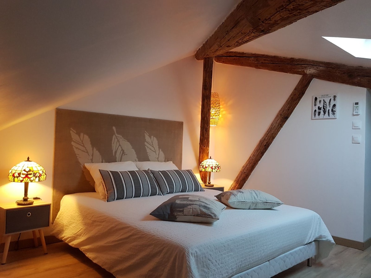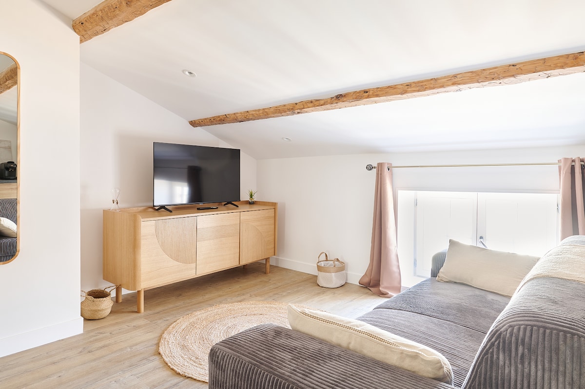 Un cocon sous les toits,lumineux et chaleureux, un petit nid pour prendre le temps de découvrir les richesses architecturales et historiques de Béziers ou faire une pause romantique en toute discretion. Idéalement situé, en centre ville en face du parc des Poètes, à 50 m des Allées Paul Riquet et à 5 minutes à pied de la gare et du Polygone. Pour votre confort, grand lit 160 , internet haut débit,douche a jet,deux TV écran plat,decoration originale, équipement neuf et climatisation.Appreciez.