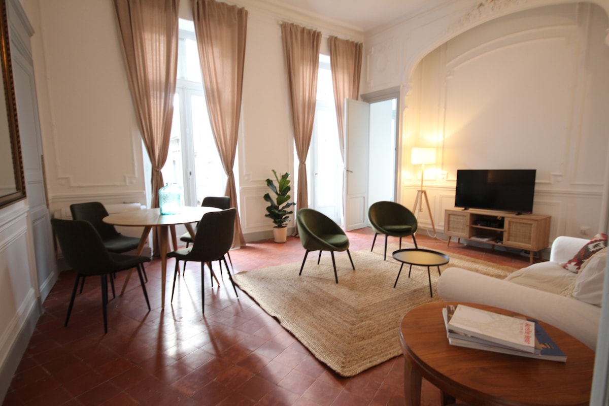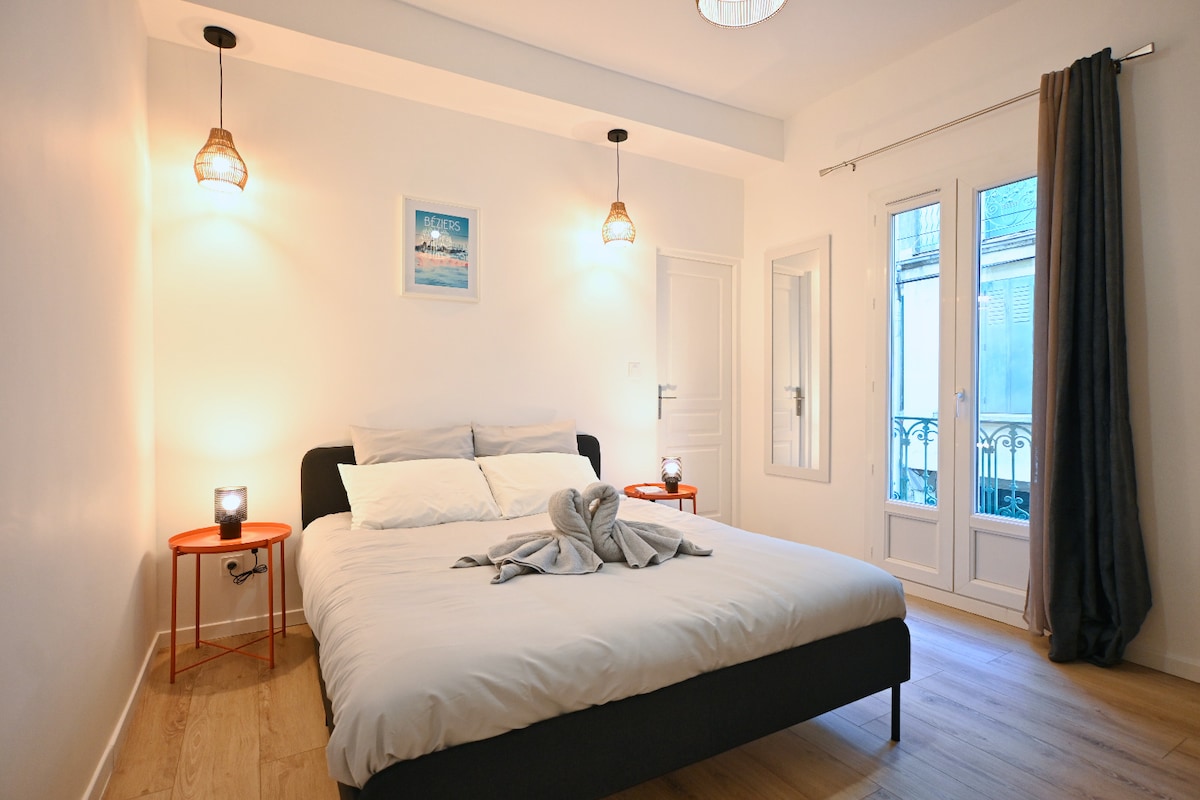 Superb 45 m² apartment, fully renovated and rated 3 stars ***, in the heart of Béziers, opposite the Théâtre des Variétés and just steps from the Allées Paul Riquet. Ideal for 2 or 4 people, only 5 minutes from the train station. Bed linen, towels, toiletries, and end-of-stay cleaning included. Book now!