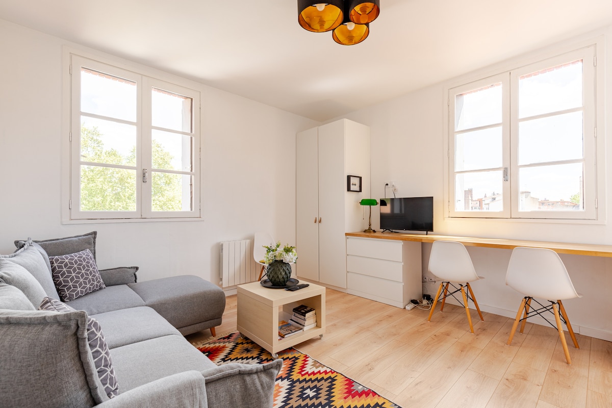 Profitez d'un logement situé sur les quais de la Garonne, dans l'hypercentre de Toulouse, lumineux et avec vue dégagée. A proximité des centres d'intérêt touristiques et des lieux de sortie, vous pourrez visiter Toulouse à pied. Un bar à proximité peut générer des nuisances sonores certains soirs, mais nos fenêtres double vitrage posées en novembre 2025 permettent un bon isolement. Si besoin des bouchons d'oreille sont également fournis. En journée le logement est calme.