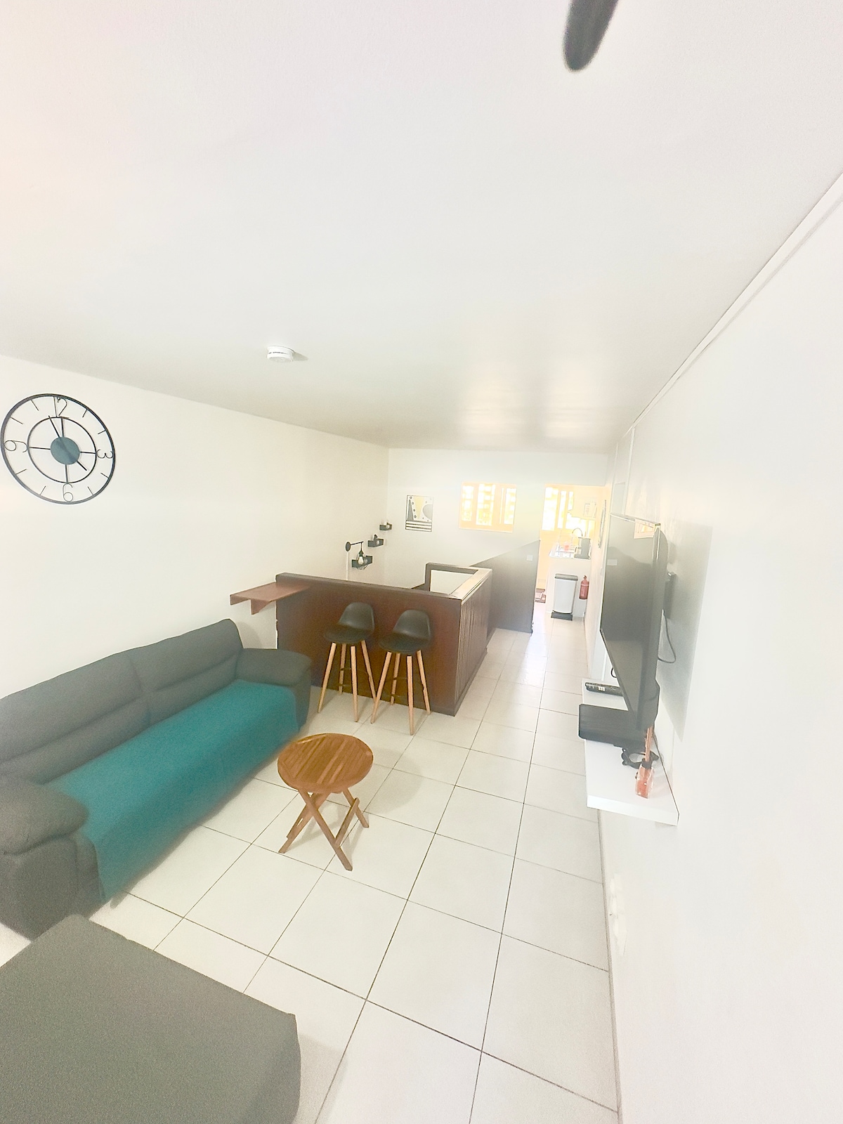 Situé dans une résidence sécurisée avec un grand jardin intérieur, il dispose de 3 chambres climatisées, 1 salle d’eau, 1 cuisine équipée ( four, plaque électrique, frigo, lave linge, micro onde),un double séjour et un coin bureau. Idéal pour vos séjours ( courte durée ou moyenne durée) pour découvrir la Guadeloupe ou vos déplacements professionnels. Il se trouve à 5 mins du lycée BAIMBRIDGE, 10 mins du centre commercial MILENIS, 10 mins du CHU. LE PLUS: MAC DO et boulangerie à pied