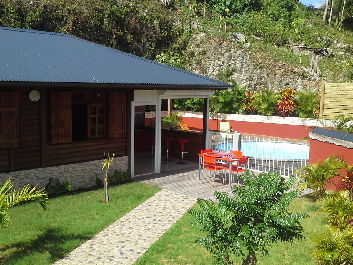 Vous êtes au coeur de la Guadeloupe et de la campagne exotique ! Reconnectez-vous à la nature sans vis à vis… Dans un quartier calme et authentique, nous vous attendons dans un bungalow de charme à la déco soignée (50 m2) Depuis votre terrasse, ou depuis votre piscine privée admirez le coucher de soleil sur la soufrière, aperçu mer et les Saintes installez-vous sur le filet de détente sous le flamboyant pour une expérience unique Pas de wifi, 4G ok Parking gratuit sécurisé