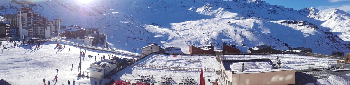 Luxurious 25 m2 studio fully renovated in 2022 (4 guests) is ideally located in the center of the station of Val Thorens ; just at a few meters of all shops, ski schools and rental centers. The residence is located on the main street; however the studio, at the 3rd floor, is oriented to the mountains and so is protected from the noise of the street by triple glazed windows. • REAL Ski in Ski out • Household linen included. The beds are made for your arrival • WIFI • Disney+ , Eng ch. • Ski box