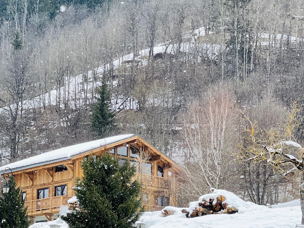 Very high-standard chalet in a village near St Martin de Belleville (in the heart of the 3 Valleys ski area), completely renovated by an architect: large living room with view, spa and sauna, 5 bedrooms and 5 bathrooms, hotel services, ski room with boot warmers etc... Le Hameau de Béranger is a haven of peace, where magnificent chalets mingle with the local way of life (farm 1 km away), old bread oven and chapel. Ski lifts are 3 km away.