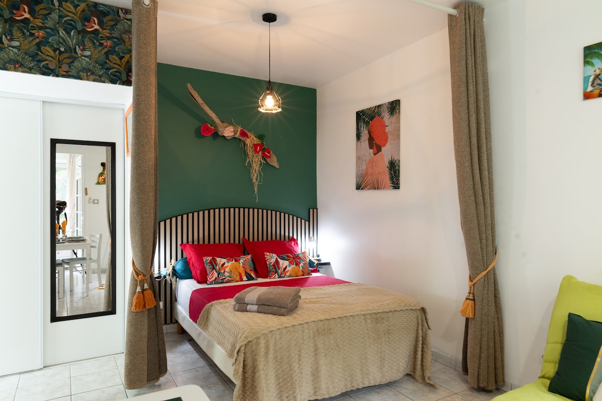 Turtle Bay Locations Grande Anse - Martinique Mini Villa T1 en hauteur offrant une vue panoramique sur la mer et la campagne. Accès mer à 50m à pieds. Plage connue pour ses nombreuses tortues vertes visibles en palme masque tubas toute l’année. Composée d’une chambre climatisée avec moustiquaire, une salle de douche avec WC, une cuisine équipée sur la terrasse couverte et une piscine privée de 2m*3m sur la terrasse découverte. Restaurant TiSable à 50m et petits commerces à 500m.