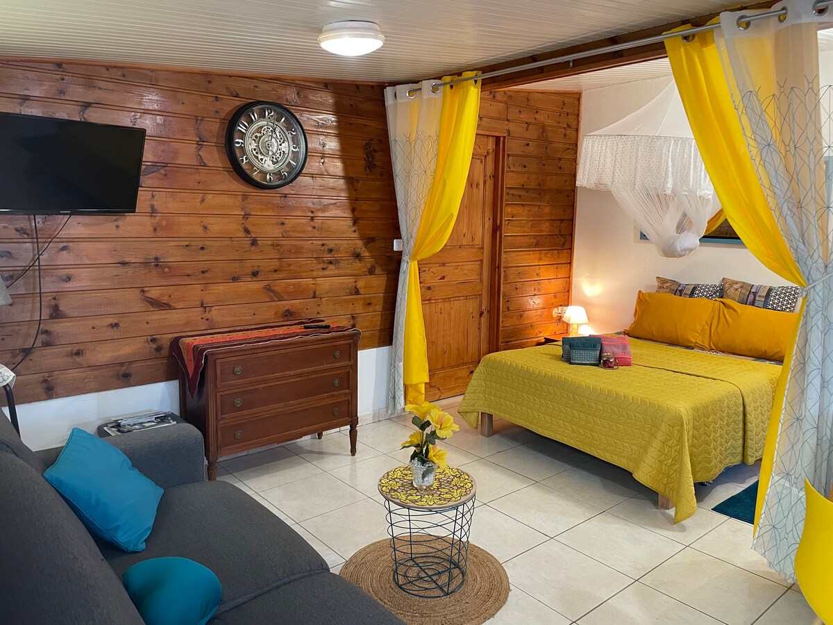 L'appartement de 35 m² environ est au rez de chaussée d'une grande maison construite sur deux niveaux, il se trouve sur les hauteurs du Bourg des Anses d'Arlet, vous serez au calme avec une vue exceptionnelle sur les anses avec une grande terrasse de 29 m2 avec Stores. L'appartement comprend un séjour (avec clic-clac), une chambre climatisée (lit de 200) une salle d'eau avec wc et une cuisine équipée ( four plaque gaz,hotte réfrigérateur, micro-ondes, lave-linge)TV Connexion WIFI salon de jardin