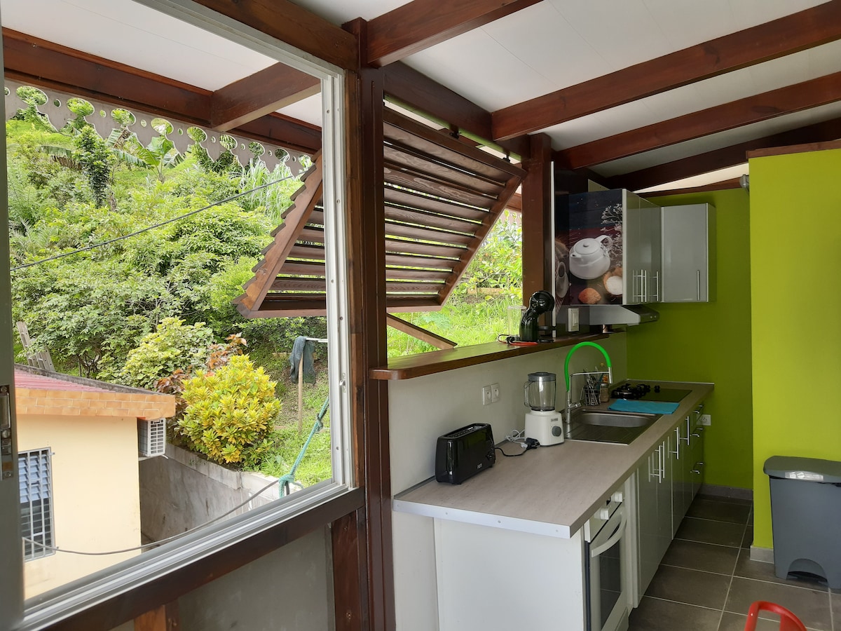 Charming new chalet all in wood nestled in the greenery, 7 min walk from the beach of Anses d'Arlet. You have a large bedroom with a beautiful adjoining bathroom and a large walk-in shower as well as a dressing room and a washing machine. The large decked terrace hosts the kitchen area (modern and fully equipped) and living room overlooking the garden. Small sea view from the terrace. Exceptional situation in full freshness, fruit trees and small river. Unique place!