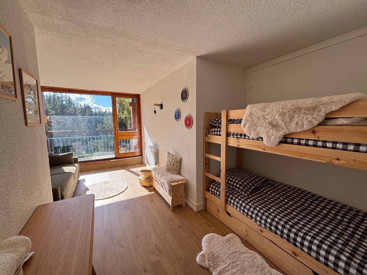 Logement 28m2 avec balcon exposé plein sud Nombreux atouts : - 4 couchages (1 canapé conv.Poltronesofa neuf12/2025+1 BZ) - départ ski aux pieds - Equipé à neuf (lave vaisselle, 2plaques vitrocéramique, appareil raclette,/fondue, cafetiere.nespresso...) - SDB avec baignoire - support ski et chaussures Rénové avec soin dans le but d'y partager des moments conviaux de glisse et de randonnée en famille et entre amis Forfait ménage70 e Possibilité de louer chaise/lit bébé Linge lit Linge toiletté