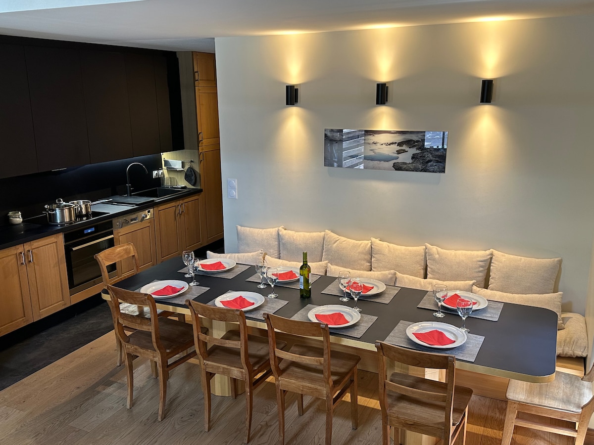 Appartement de montagne chaleureux pour 4 à 6 personnes (55m2) situé au coeur de la station de ski Arc 1950. Entièrement rénové pour offrir un confort 5*. Sous les toits au 7ème étage, vous bénéficiez d'une vue exceptionnelle sur le Mont-Blanc et sur l'Aiguille Rouge (2 grands balcons). La cuisine est intégralement équipée (four, micro-onde, lave-vaisselle, plaques induction, machines à café filtre et Nespresso, bouilloire, grille-pain, appareil à raclette).