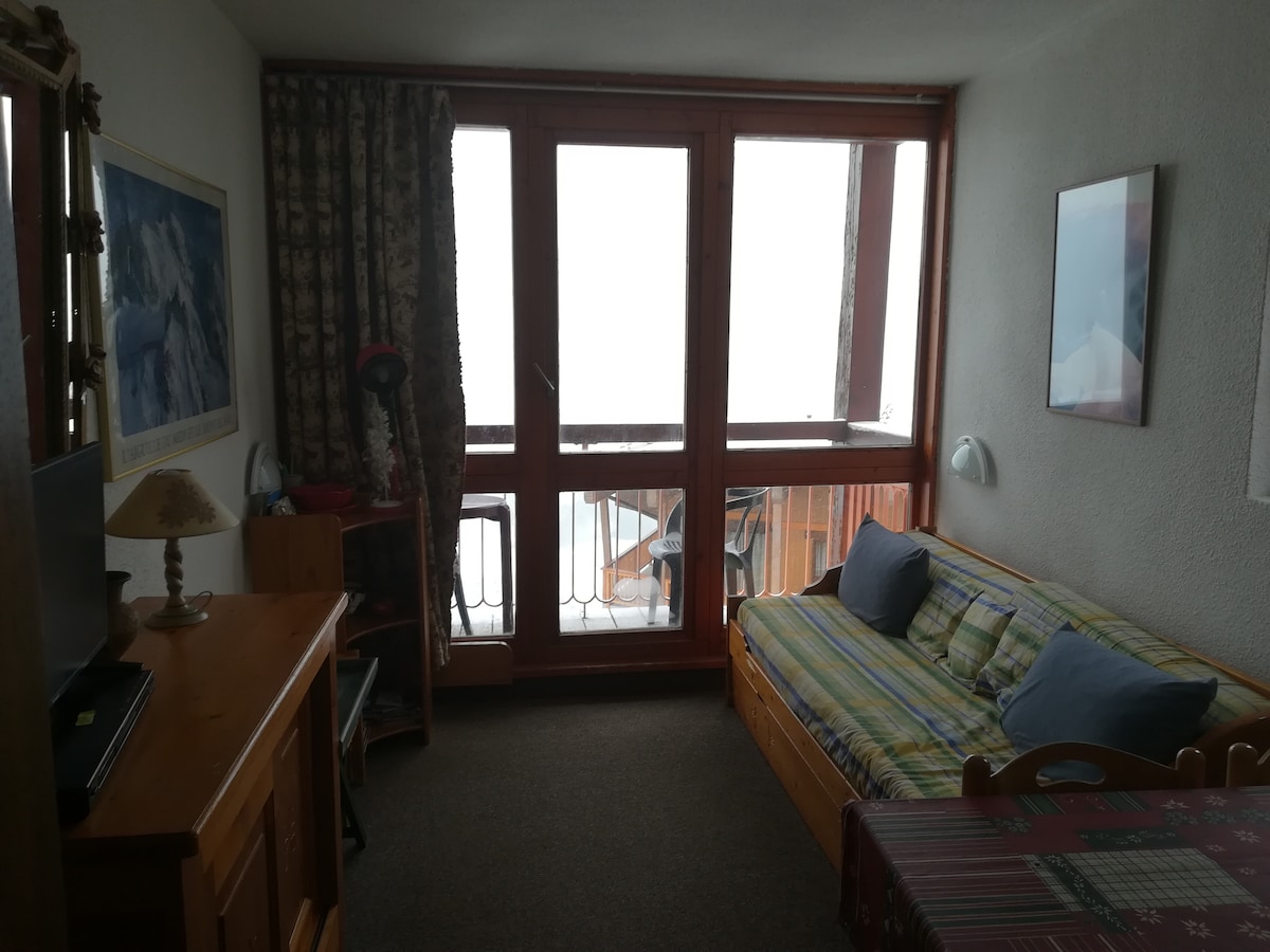 Loue appartement chaleureux, rénové avec soin, aux Arcs 2000. Situé au 4ème étage pour 5 personnes dans la résidence "Le varet" qui a un accès direct sur les pistes (par l’arrière de l’immeuble). Vous profiterez d'une vue imprenable sur le Mont-blanc sans vis à vis depuis le séjour. L'APPARTEMENT de 30 m2 se compose d'une pièce de vie lumineuse et spacieuse pour partager de bons moments en famille ou entre amis. 2 lits simples 1 lit superposé 3 couchages 1 lit bébé Wifi Service de conciergerie