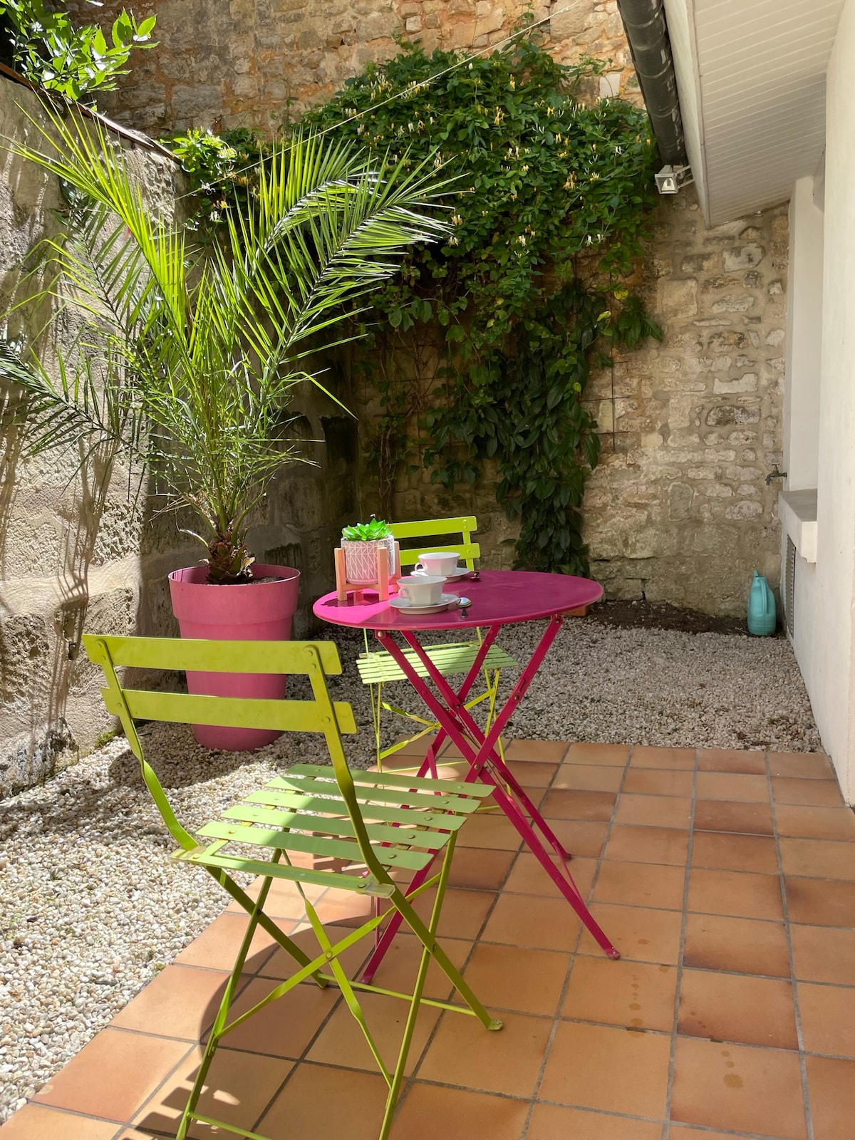 studio de 20m2 pour deux voyageurs entièrement équipé le petit déjeuner vous sera offert Le studio est situé dans au fond d'une arrière cour au calme vous disposerez d'une entrée indépendante et d'une terrasse La situation du logement est idéale à 5 min à pied de la gare de Saintes de tous les commerces essentiels Des sites sont à découvrir autour du logement comme l'Abbaye aux dames et l'Arc de Germanicus je me tiens à votre disposition pendant la durée de votre séjour