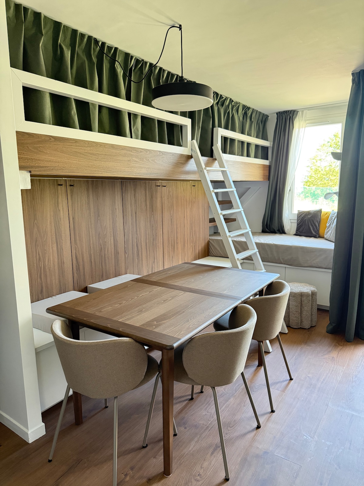 TARIF CURE 2025 950€/ 21 nuits Appartement classé 4 étoiles. Avec sa superbe vue sur le grand Bec, sommet de 3 398 mètres d'altitude, cet appartement très lumineux et entièrement meublé, peut accueillir jusqu’à 4 personnes. Situé au niveau supérieur du chalet, il dispose d'une chambre avec un lit double (160x200) ou deux lits simples (80x200). Au salon, vous trouverez également un canapé lit (dimension 120x200). 1 chien accepté sous conditions (+ frais de 5€/jour) Chat non accepté