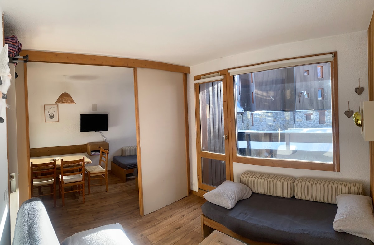 Appt de 27 m² situé plein sud et sur les pistes à 1800 m d'altitude avec balcon. Vue magnifique sur les montagnes. Il est central (commerces, restaurants + guichet forfaits) et au cœur des 3 vallées. Très fonctionnel, il est spacieux la journée et offre 2 chambres la nuit (cloison amovible avec d'un côté 2 lits d'1 pers et de l'autre 1 clic clac + 1 pt lit) Draps et serviettes non prévus (possibilité de location) voir photo