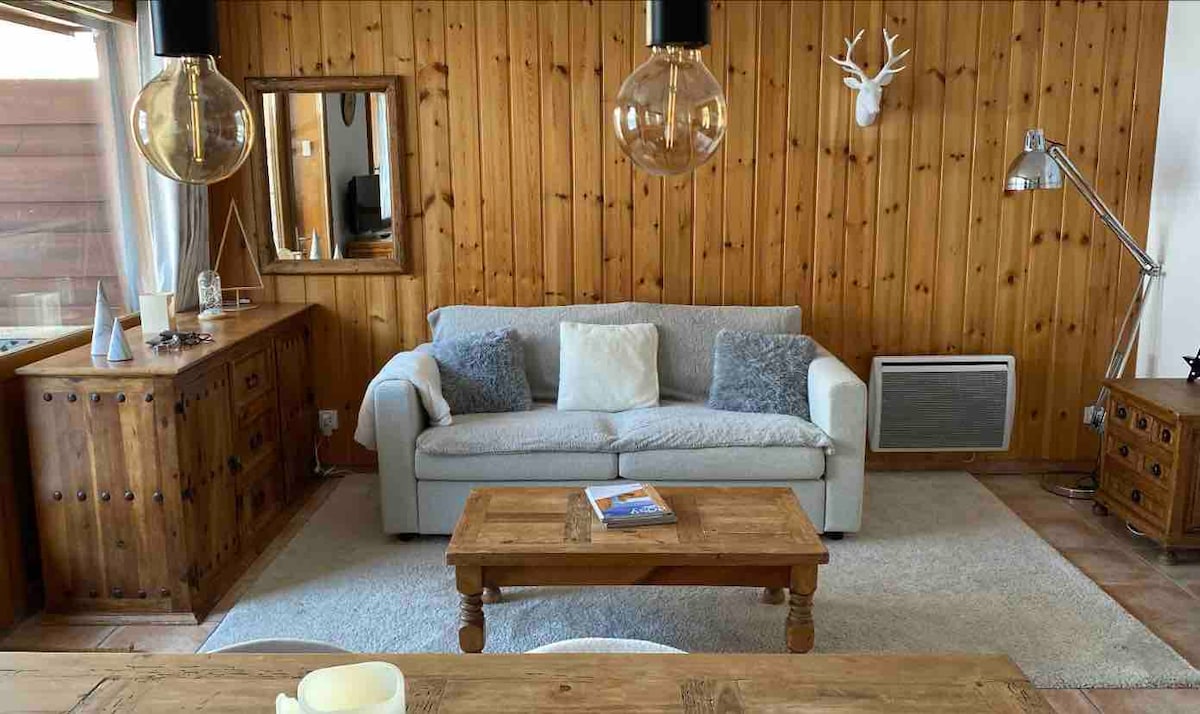 Appartement ambiance chalet de 38m²+grand balcon. 6ème étage/8 (avec ascenseur), idéalement situé. 2 chambres, une parentale (lit 160/200) et l'autre avec 2 lits superposés (140/190). 1 salle de bain avec douche, lave-linge, 1 WC séparé, cuisine/salon avec four multi-fonctions, lave-vaisselle, appareil à raclette, à gauffres... Casier à skis au rez-de-chaussée. Parking gratuit non privatif façe à la résidence. 4G orange OK. Possibilité location garage/linge en supplément. Ménage compris.