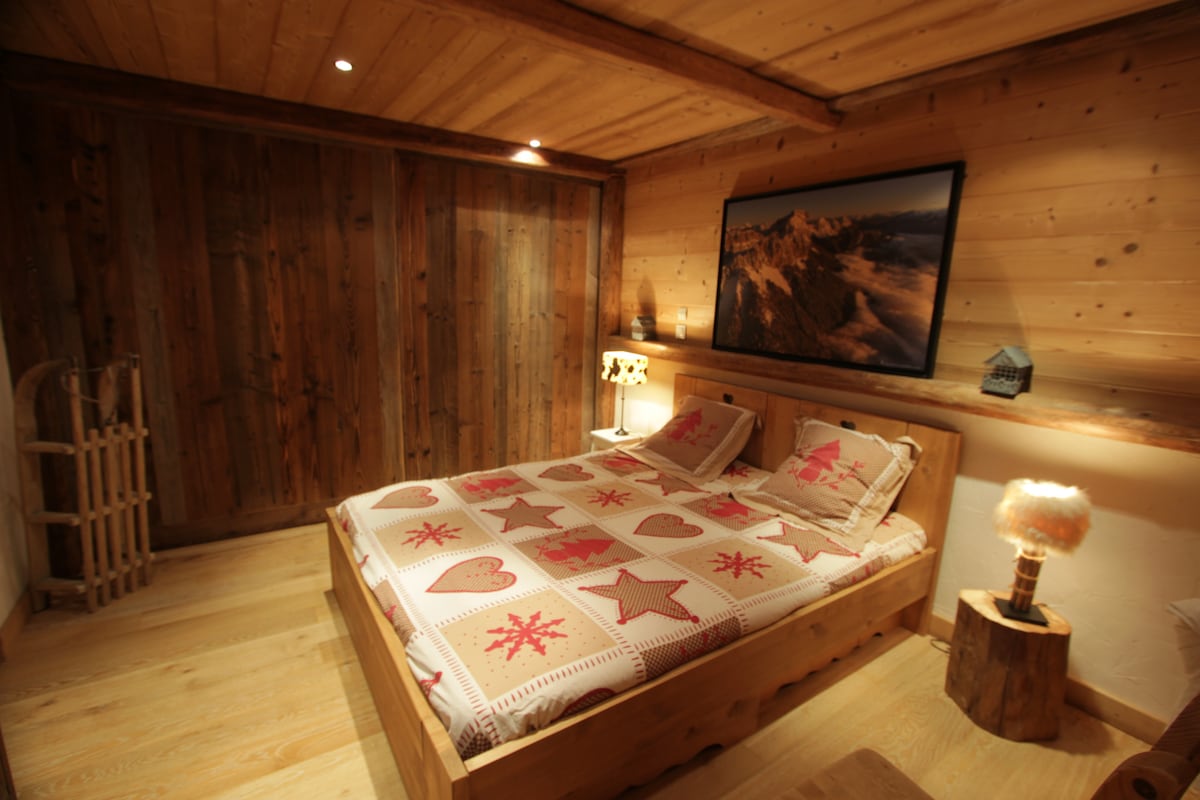 Add logs to a fireplace with a massive stone hearth and recline on a rustic wooden sofa. Gaze through picture windows at the alpine forest surrounding an authentic chalet. Return from the slopes and unwind in a luxury sauna in a cabin-chic bathroom. Une chambre de 25m2 avec lit double, rangements, armoire authentique. Un salon chaleureux et spacieux avec double baies vitrées donnant sur le Mt Blanc et cheminée. Et un sofa banquette convertible en 2 lits individuels. Cuisine pratique et toute équipée. Une salle de bain en granit avec douche et sauna 3 personnes. Une terrasse devant forêt et ruisseau ( avec fréquente visite des biches - voir photos ), avec fontaine et vue imprenable sur le massif du Mt Blanc. The chalet is an individual construction fully available and reserved for the guests. So are the terrace and the surroundings ( a small river, a private bridge and access to the forest ). A disposition pour toute question. Dans le hameau de Coupeau : Chalet authentique dans la forêt au-dessus des Houches avec vue exceptionnelle sur le massif du Mont Blanc. En Bord de petit torrent avec des biches A 5 min en voiture des Houches, à 10 min de Chamonix, à 1h de Genève. Easy access by road to the chalet. 2 kms from Les Houches and 10 kms from Chamonix. Parking just behind the chalet A fully renovated old chalet. With all modern comfort ( inc Sauna for 3 ) and top decoration. A unique view on the MontBlanc chain. The chalet is in the hamlet of Coupeau, in the forest above Les Houches, with exceptional views of Mont Blanc. It's a 5-minute drive to Les Houches, 10 minutes to Chamonix, and an hour to Geneva.