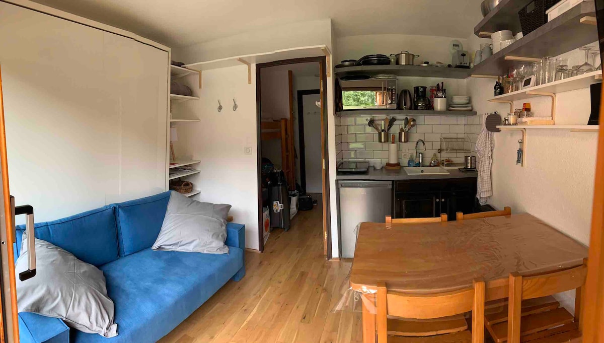Appartement 19m2 tout confort à quelques pas des remontées. Il est composé à l’entrée d’un couloir avec un lit superposé (80x190) et d’une pièce principale avec un lit gigogne de 160x190 (2 matelas de 80x190) / cuisine équipée entièrement refaite à neuf. D’une salle de bains , douche refaite à neuf et toilette séparé. Casier sécurisé au rez de chausée. Les draps et serviettes de toilettes sont fournis. Le ménage doit être fait à votre départ : le sol, la cuisine, le frigo et les sanitaires.
