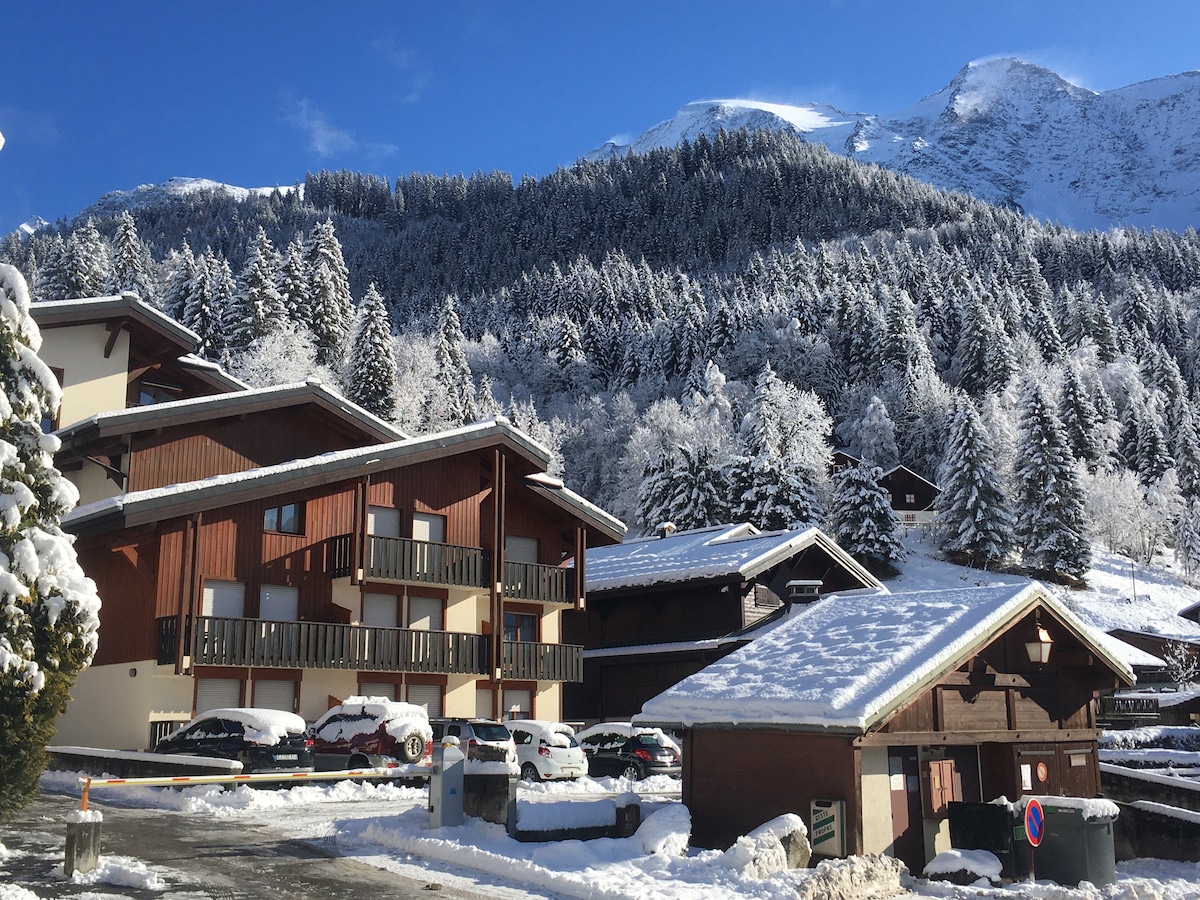 Classé 2 étoiles en meublé de tourisme, je vous propose mon petit paradis face Mont Blanc de 26m2 ,chaleureux et équipé pour 1 à 4 personnes situé au 1er étage d'un chalet avec balcon qui vous offrira une vue Mont Blanc à couper le souffle. A 5 min des pistes de ski l’hiver ( navette gratuite dans la résidence ) et piscine chauffée l'été juste devant le chalet ( ouverture du 1er juillet au 1er sept ) . Village /Commerces à 8kms,thermes et gare sncf à Saint Gervais le fayet à 11kms.