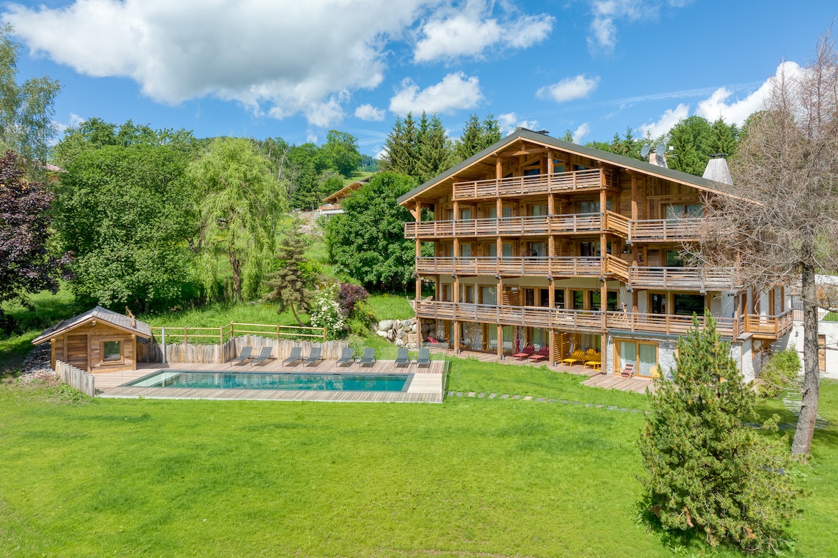 Exquisite individual chalet with private hot tub and wood-fired barrel sauna, La Petite Forêt is a perfect alpine retreat with views of Mont Blanc and more. Sunny garden with bbq etc gives onto to pine forest. Walk or cycle straight from the garden on car-free paths, winter and summer. Secluded yet close to village (400m), lift (700m), XC ski trails (100m). Private parking. Light and airy open plan living / kitchen / dining area, new handmade kitchen with granite surfaces & modern appliances.