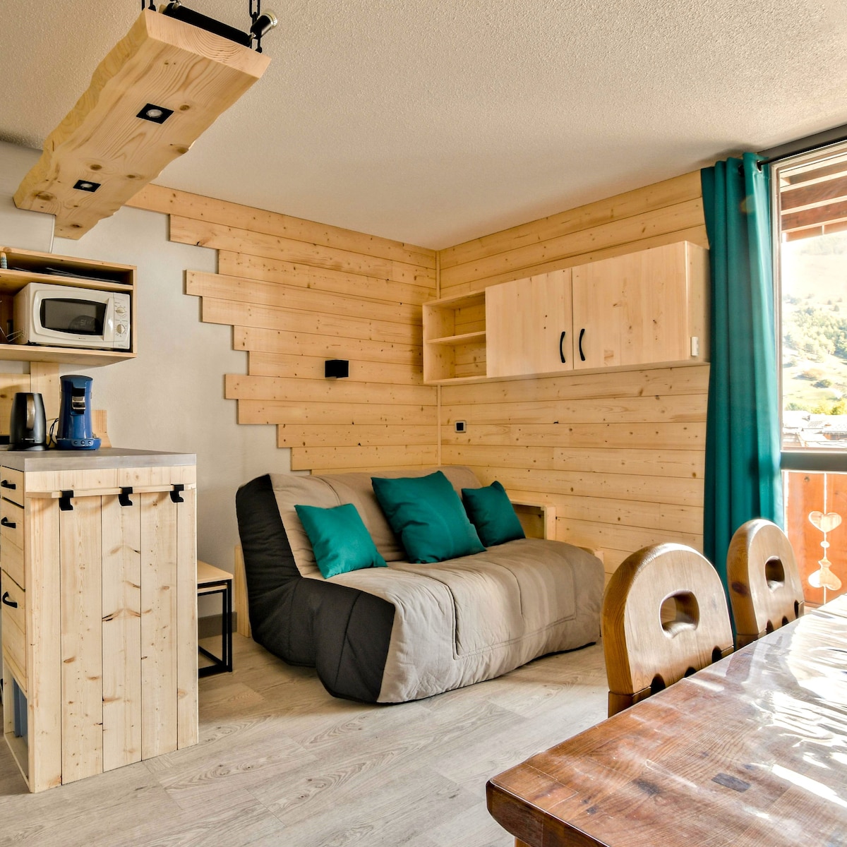Studio lumineux rénové de 23 m² avec VUE MAGNIFIQUE sur les Écrins Balcon exposé SUD dans Résidence "Le Pluton" + 1 place de parking couverte et privative - 4 personnes (2 adultes + 2 enfants) - au calme et proche de tous les commerces - Télémix Super Venosc à 50m et Accès au Jandri Express et Diable en 5 minute à pied - Canapé convertible matelas de qualité + coin montagne avec lits superposés (séparé par une porte) - Une salle d’eau, un WC séparé, une cuisine équipé, casier à skis, WIFI